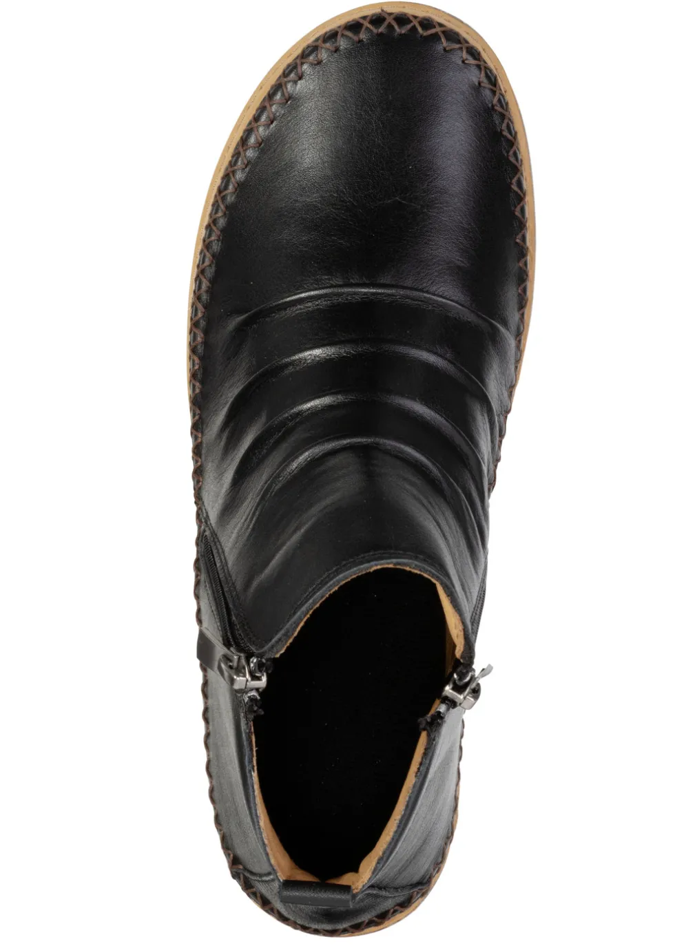 Boots aus Rind-Nappaleder, mit flotter Raffung: zwei Seitenreißverschlüsse, Textilfutter, herausnehmbares Fußbett, superleichte TR-Laufsohle sowie 15 mm Keilabsatz. Schafthöhe ca. 9 cm