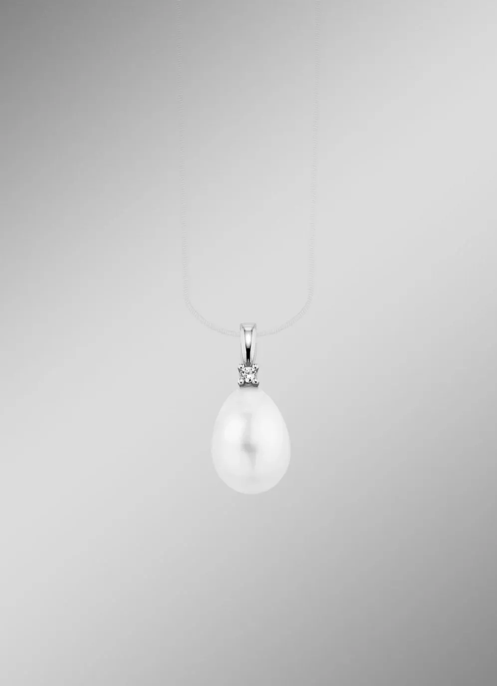 Dieser zauberhafte Anhänger aus Weissgold 375/-fein ist ein zeitloses Schmuckstück, das Ihr Dekolleté veredelt. Die tropfenförmige Süßwasser-Zuchtperle mit einem Durchmesser von 10 mm strahlt natürliche Eleganz aus. Ergänzt wird sie von einem funkelnden Brillanten der in Weißgold eingefasst ist.