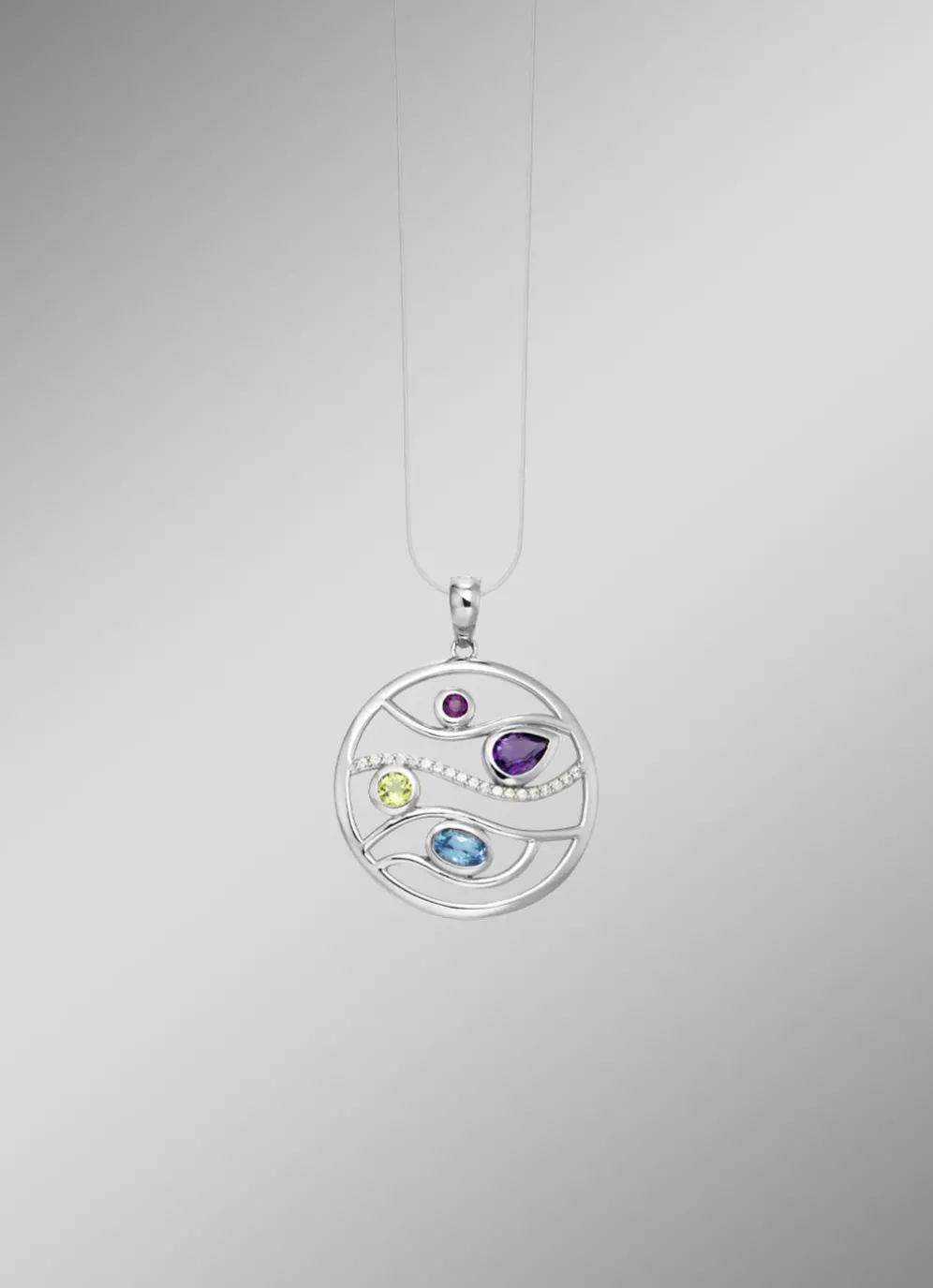 fasziniert durch seine prachtvollen synthetischen Zirkonia in amethystfarben, blautopasfarben, peridotfarben, rhodolithfarben und klassischem Weiß. Mit einem Durchmesser von 30 mm ist dieses Schmuckstück ein beeindruckender Blickfang, der jedem Outfit einen Hauch von Glamour verleiht. Die Kombination aus poliertem Silber und funkelnden Farben macht diesen Anhänger zu einem unverzichtbaren Accessoire für stilbewusste Schmuckliebhaberinnen.