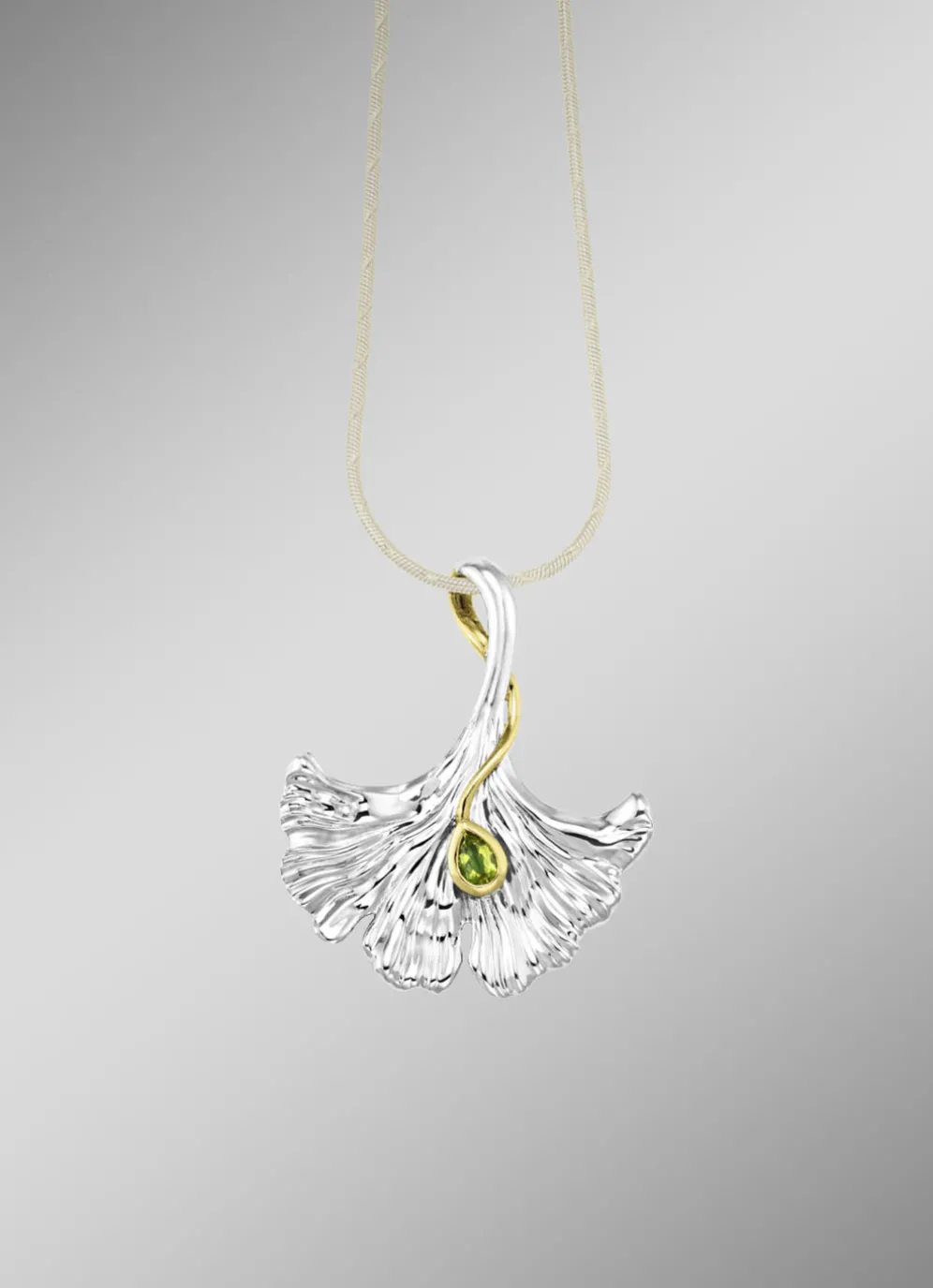 Entdecken Sie die natürliche Schönheit dieses Ginkgoblatt-Anhängers. Gefertigt aus feinstem Silber 925/- fein und in einem atemberaubenden Bicolor-Design, besticht dieser Anhänger durch seine beeindruckenden Maße von 45 x 38 mm. Der echte Peridot, kunstvoll in das Ginkgoblatt integriert, verleiht dem Schmuckstück einen Hauch von Farbe und Lebendigkeit.