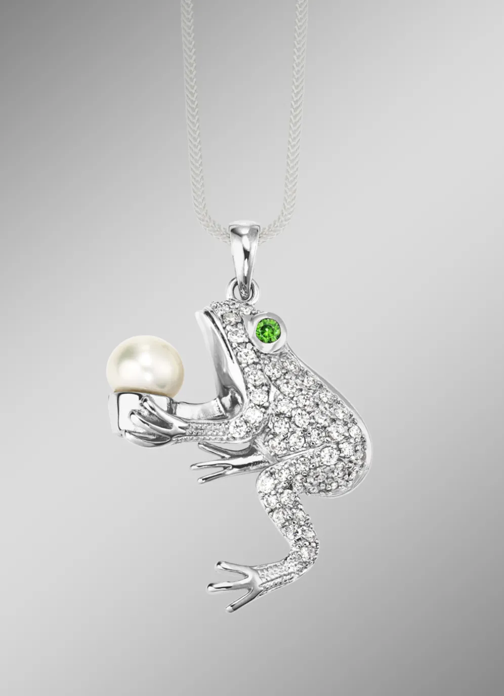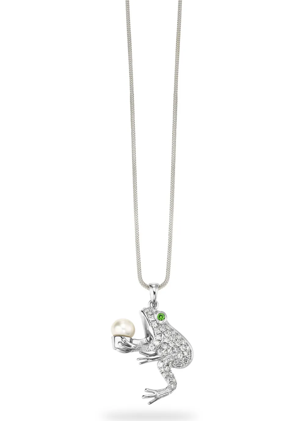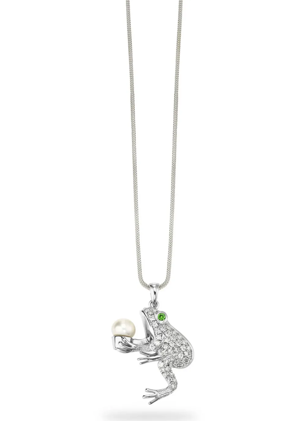 Der „Frosch“ glänzt mit grünem synth. Zirkoniasteinen als Auge. Dieser kleine „Frosch“ hält eine Süßwasser-Zuchtperle. Das Maß von diesem Frosch beträgt 40×26 mm.