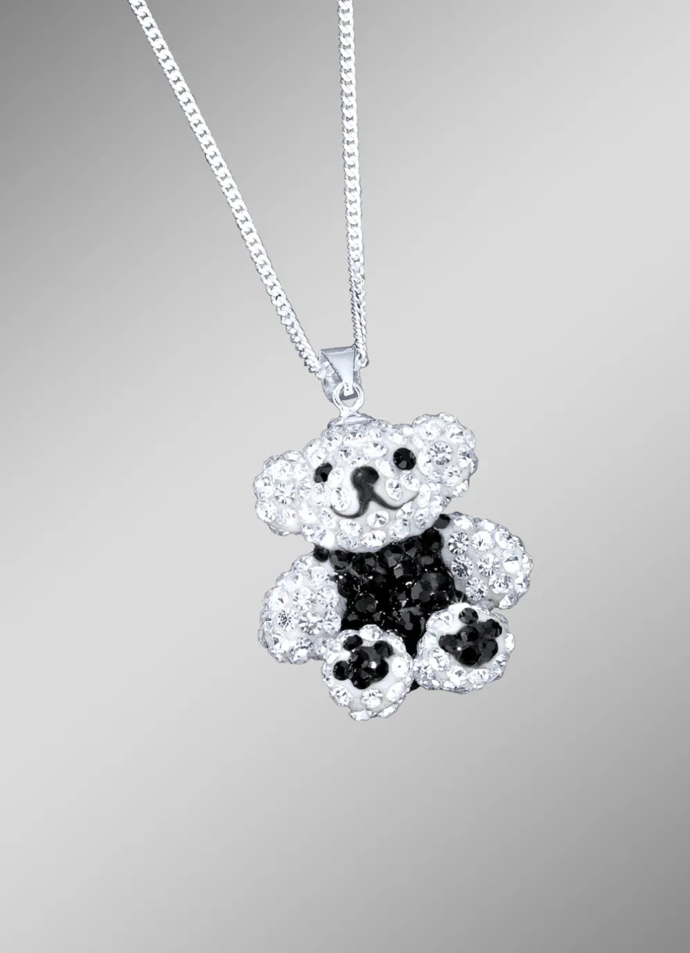 Dieses Schmuckstück ist komplett ausgefasst, mit schwarzen und weißen Kristallen besetzt und wird von einer Panzerkette in Silber 925/-fein, ca. 50 cm lang gehalten. Der Panda-Anhänger ist anlaufgeschützt und bewahrt lange Zeit seinen Glanz.