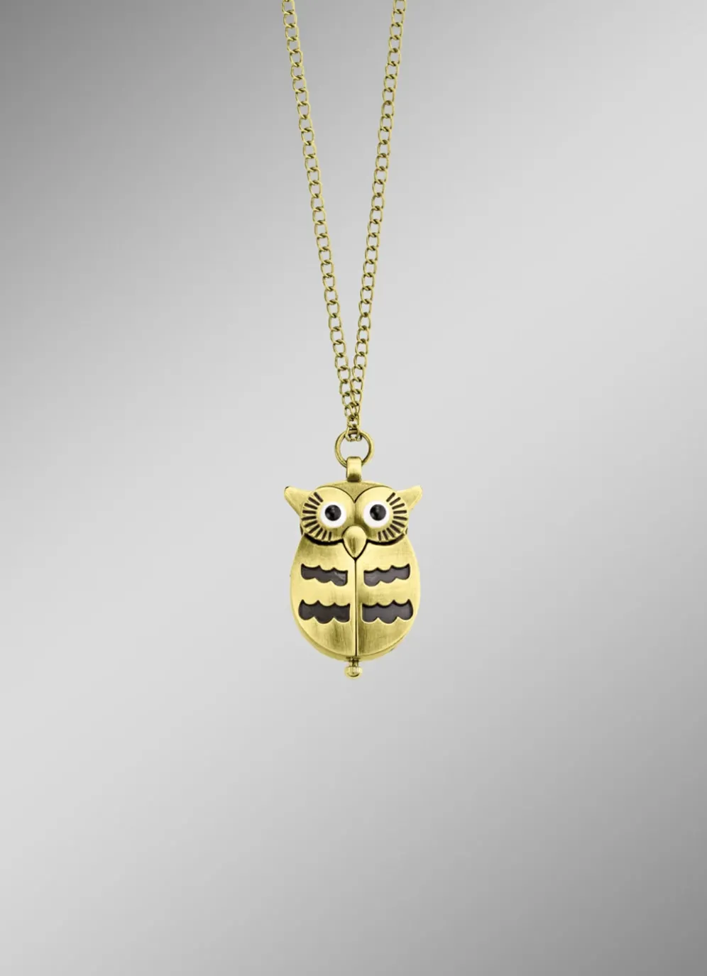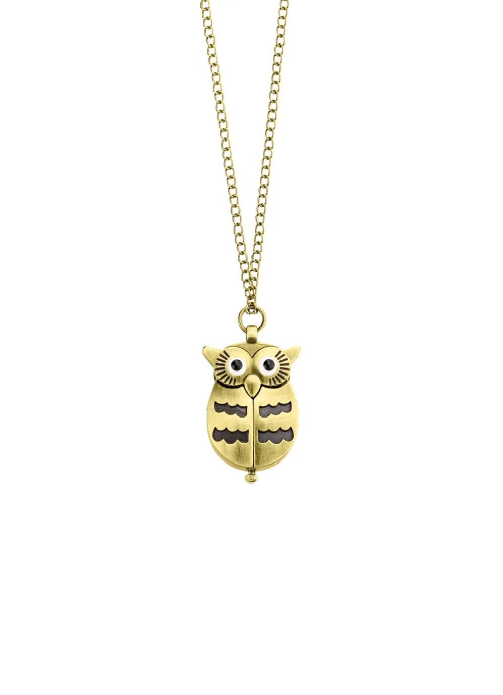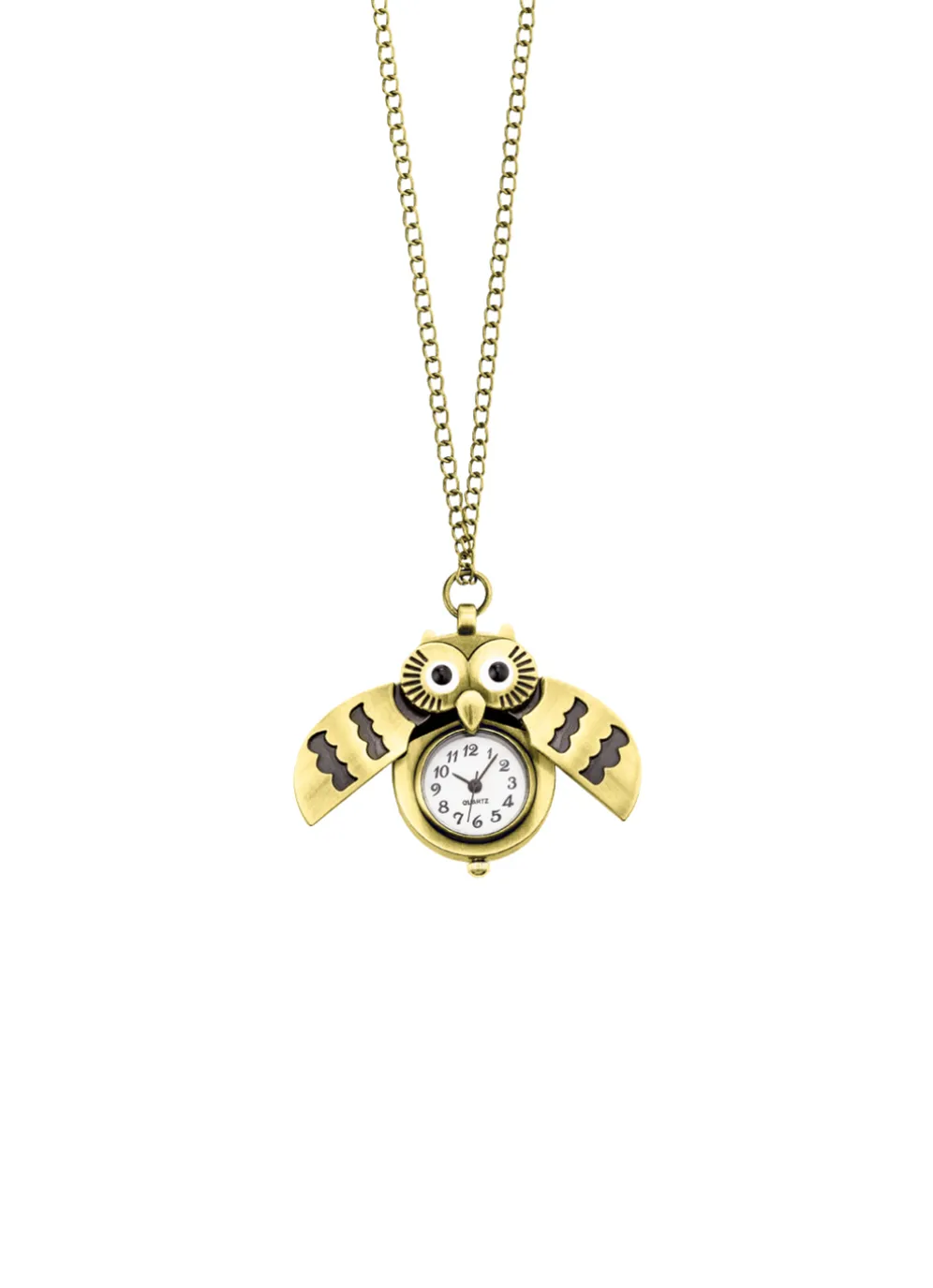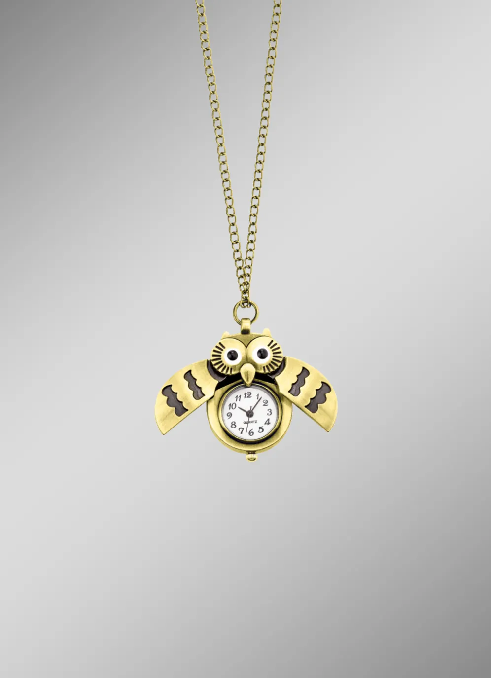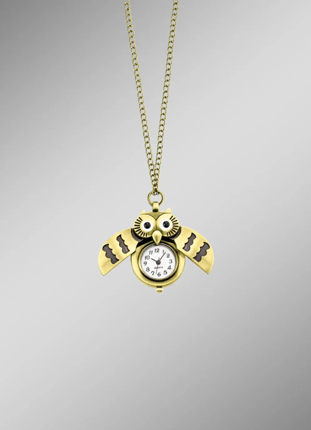 Zwei Schmuckstücke in einem: Diese wunderschöne Anhänger-Uhr in Form einer Eule ist das perfekte Accessoire für jeden Anlass! Mit ihrem spritzwassergeschützten Design und dem Mineralglas ist sie robust und langlebig. Die bronzefarbene Fassung verleiht ihr einen Hauch von Eleganz und Stil. Durch das zusammendrücken der Eulenohren öffnen sich die Flügel und die Uhr kommt zum Vorschein.