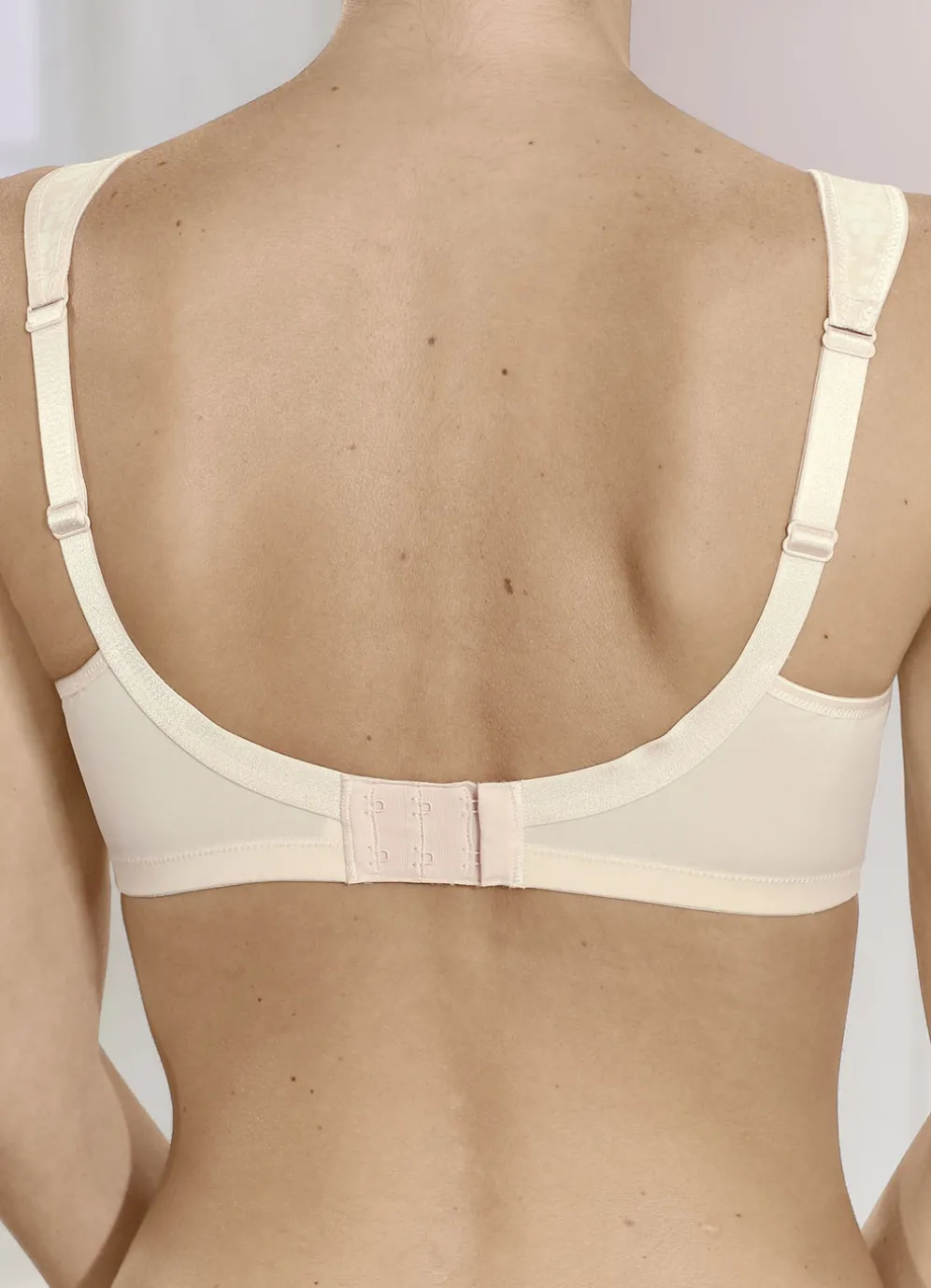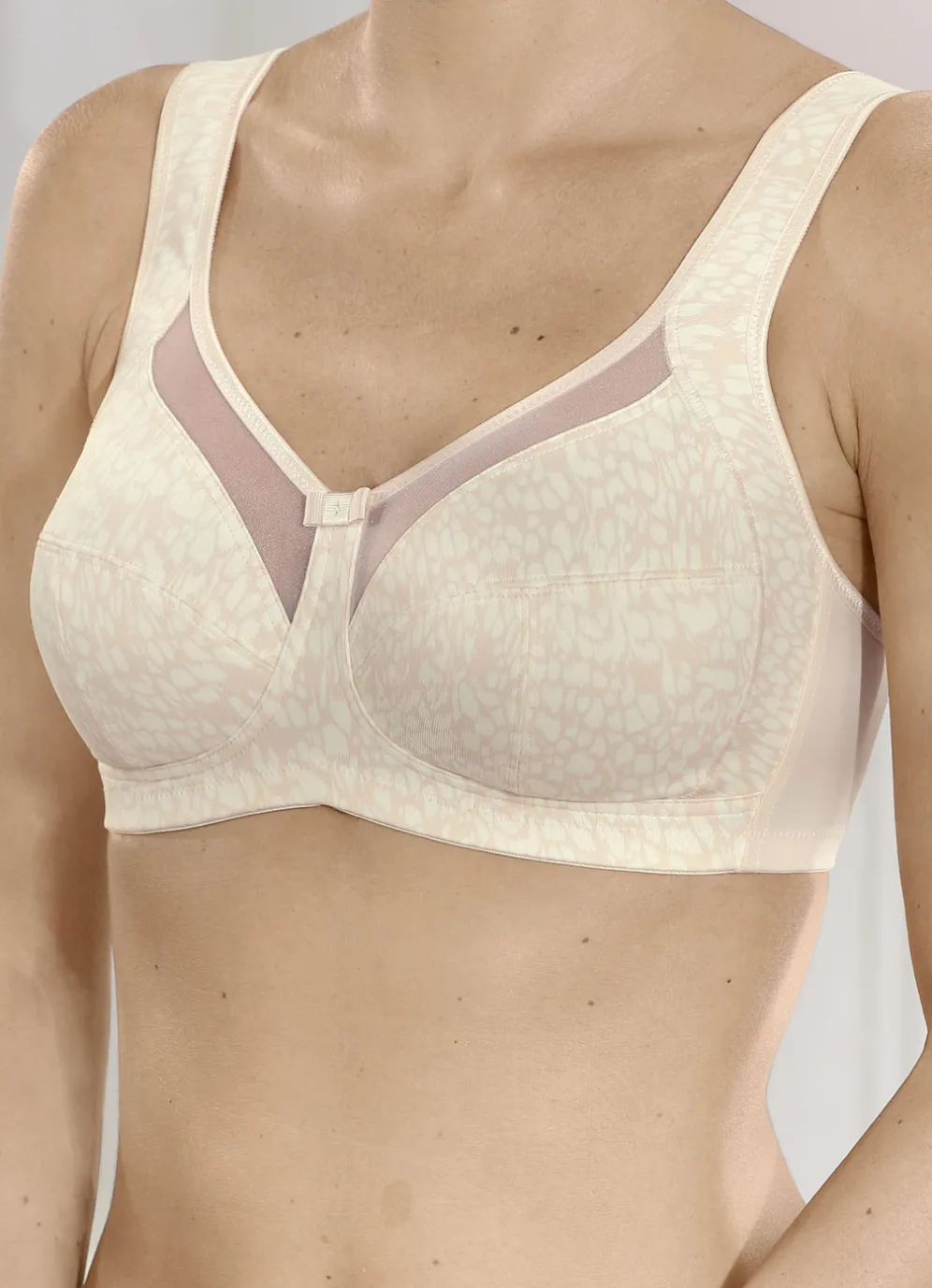 „Anita“-BH in Zartapricot, mit farbharmonischem Druckdessin im Vorderteil, transparenten Tülleinsätzen am Dekolleté, seitlicher, stützender Blende sowie breiten, im Schulterbereich gefütterten, verstellbaren Stretchträgern.