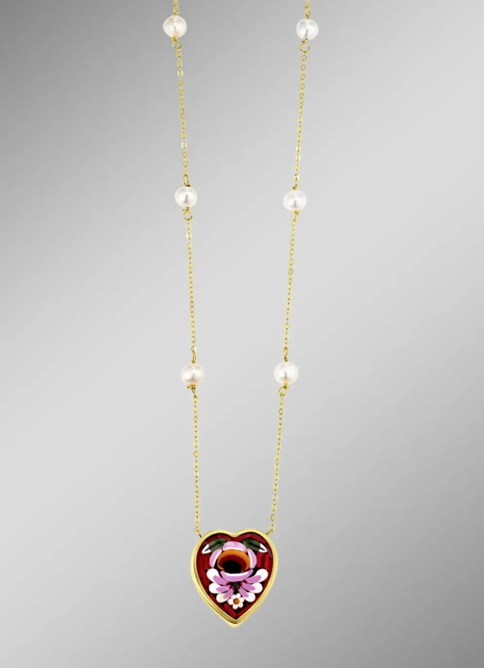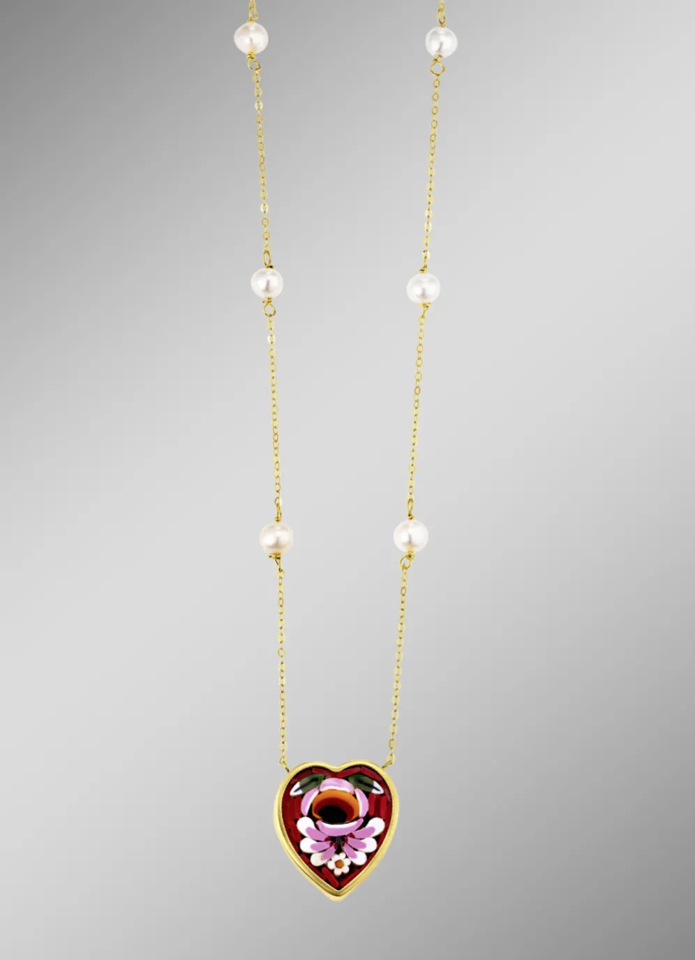 Anker-Halskette mit Süßwasser-Zuchtperlen und Mosaikglas in der Legierung Gold 585/- fein.