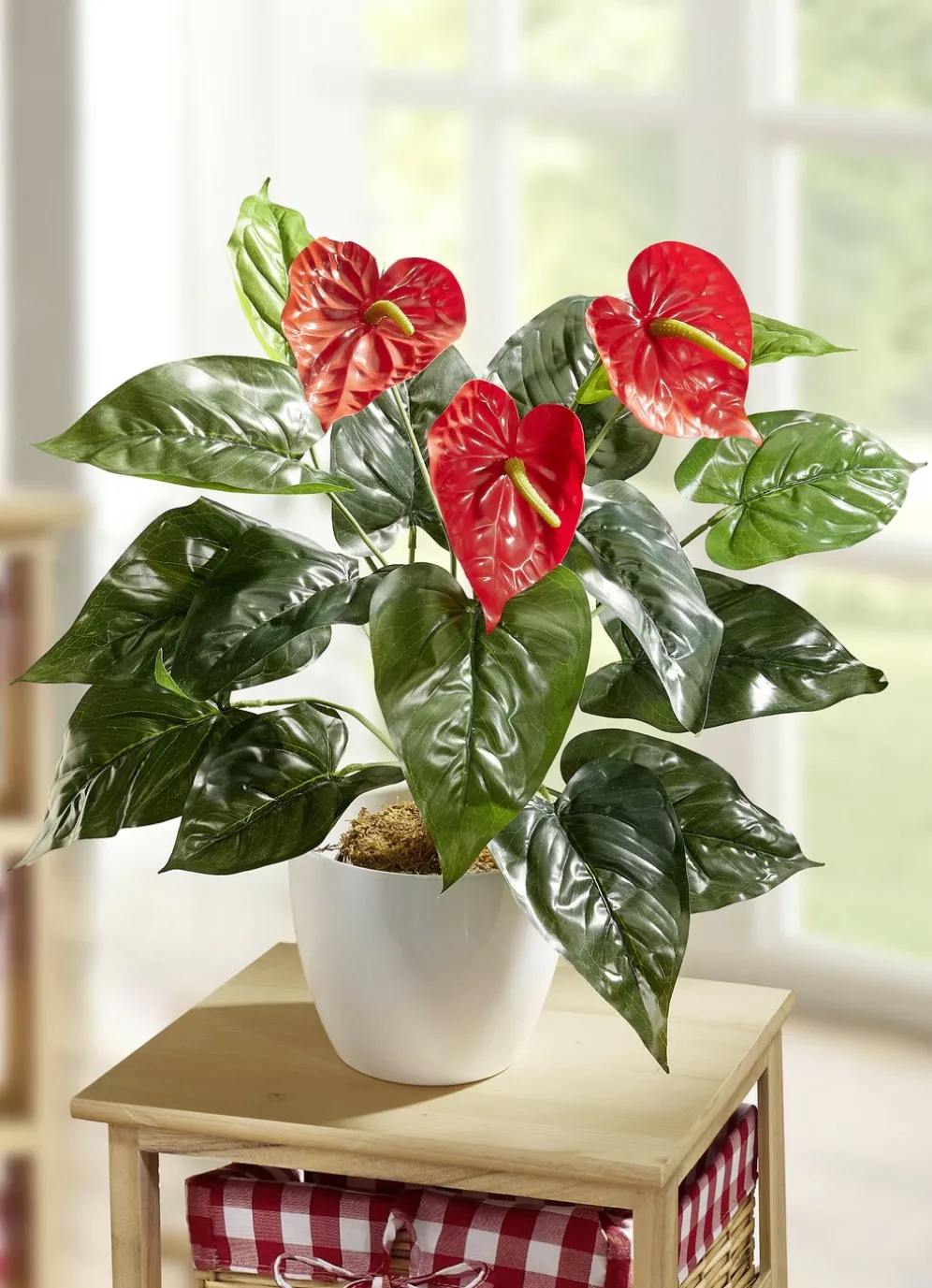 Diese echt aussehenden Anthurien sind ein immerblühender Blickfang in Ihrem Zuhause. Ganz ohne Gießen bleiben sie selbst in den dunkelsten Ecken schön grün. Aus hochwertigem Kunstmaterial gefertigt und in einen braunen Kunststofftopf fest eingesetzt. Lieferung erfolgt ohne Übertopf.