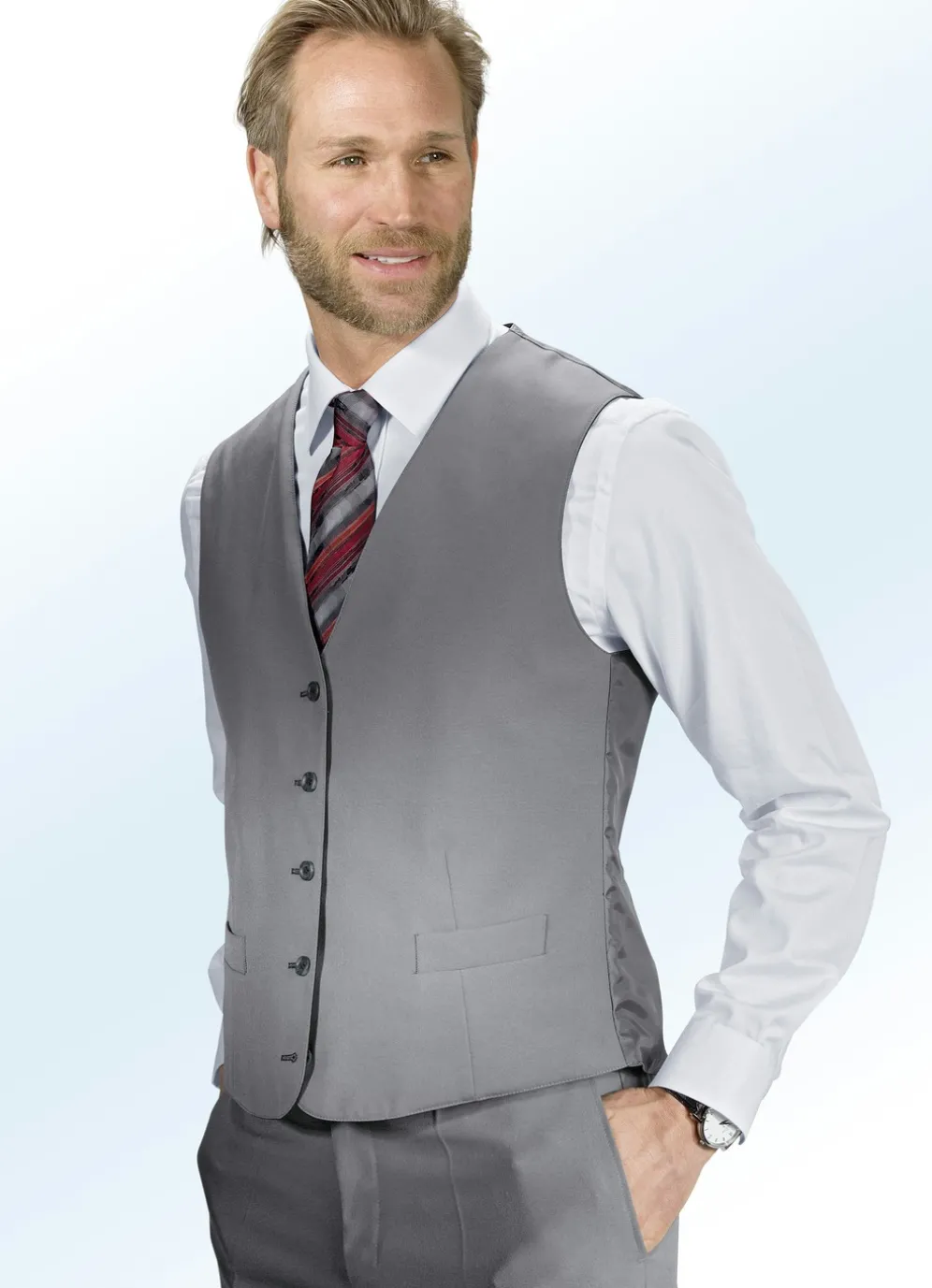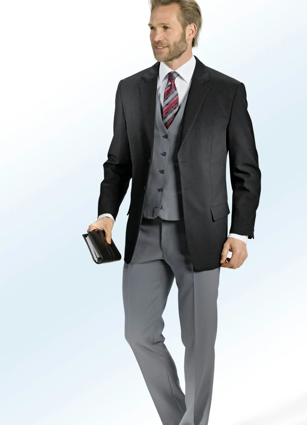 Schwarz-silbergrauer Anzug mit vielen Kombimöglichkeiten: einreihiger Sakko mit 2-Knopf-Verschluss, Pattentaschen, Schlitz im Rückteil sowie vier Innentaschen. Schwarz-silbergraue Wendeweste in einreihiger Form, mit Leistentaschen sowie Rückteil aus Satin. Eine schwarze und eine silbergraue Hose, jeweils mit Seitentaschen sowie Gesäßpaspeltaschen mit Knopf.