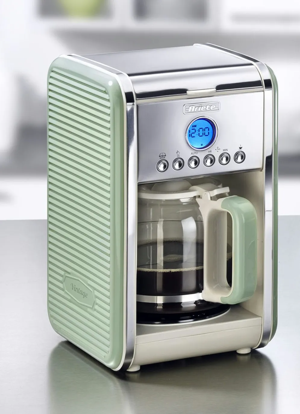 Edles Vintage-Design kombiniert mit moderner Technik. Kaffeemaschine für bis zu 12 Tassen (1,5 Liter). Mit Glaskanne und Dauerfilter. Startzeit programmierbar. Mit Pause-Funktion. 4 verschiedene Programmierungen möglich (Kaffee normal, mittel, stark und 4 Tassen). Mit Warmhaltefunktion (ca. 82 °C). Hoher Bedienkomfort. Tropfstopp und automatische Abschaltung. 960 Watt. Maße: B21xH34xT23