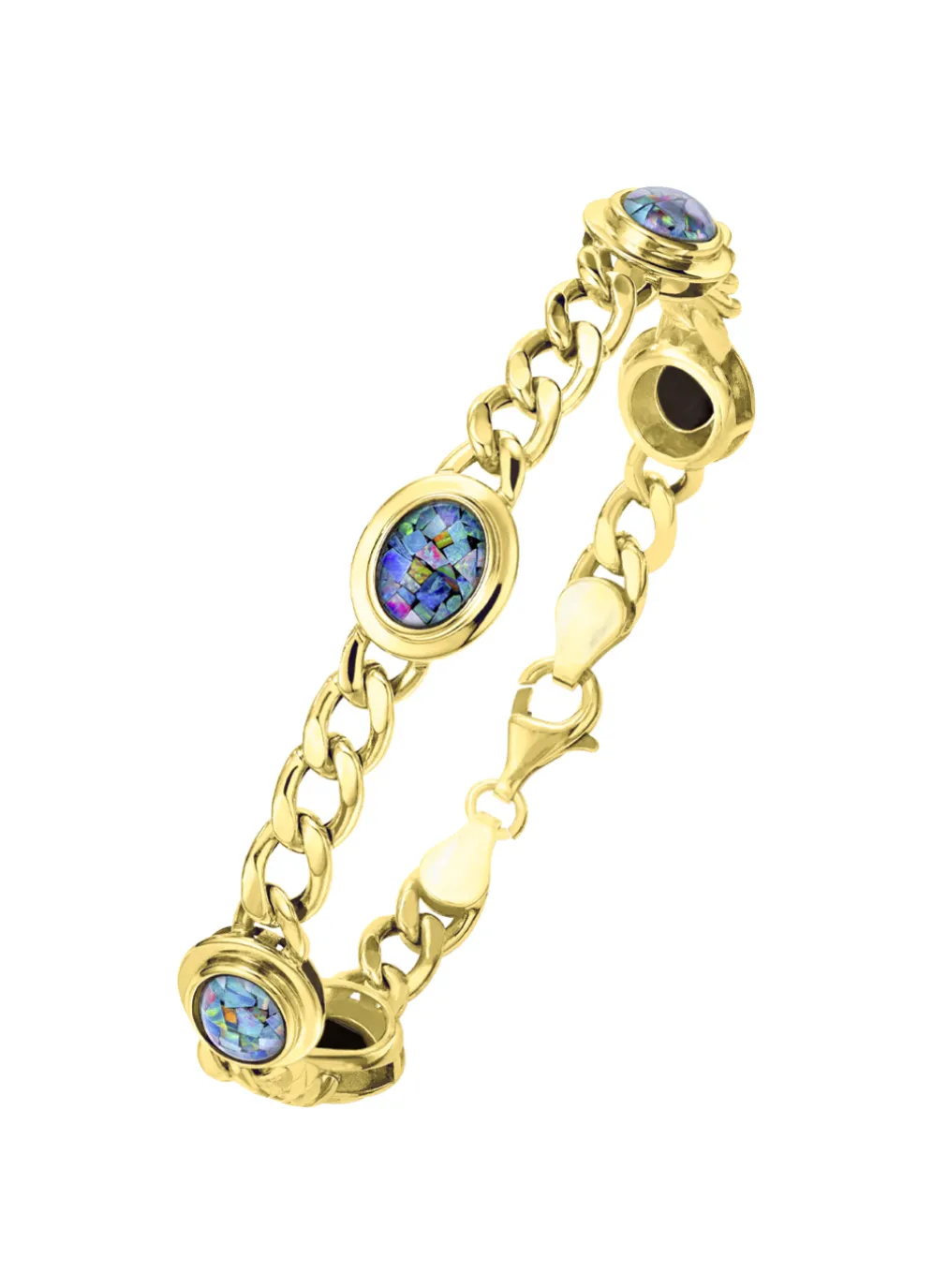 Erleben Sie die Schönheit von Opal mit diesem vergoldeten Armband aus Silber 925/- fein. Mit einem Mosaik Opaltriplette von ca. 4 ct. ist dieses Armband ein wahrer Blickfang. Ein Karabiner sorgt an der 19 mm langen und 10 mm breiten Panzerkette für einen sicheren Halt am Handgelenk.