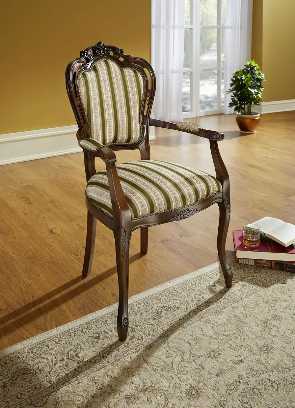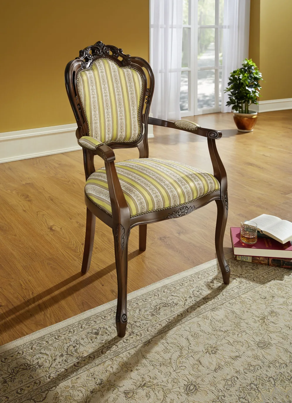 mit aufwendigen Schnitzereien am massiven, nussbaumfarbenen Buchenholzgestell. Sitzflächen mit Federkern und mit gepolsterten Armlehnen. Bezüge aus 100% Polyester. Sitzhöhe 51 cm.