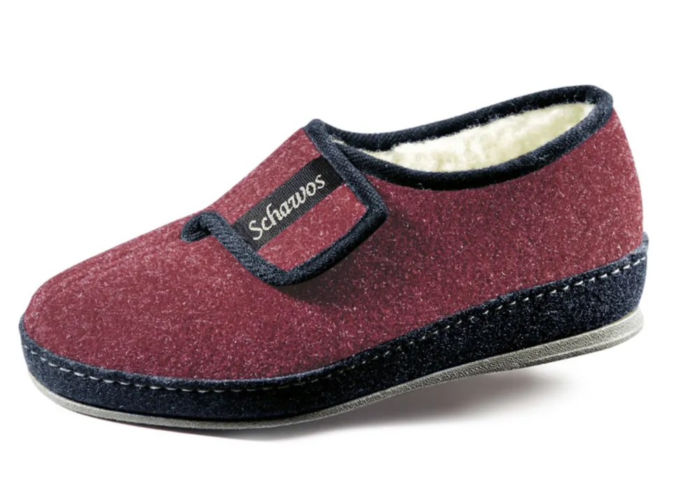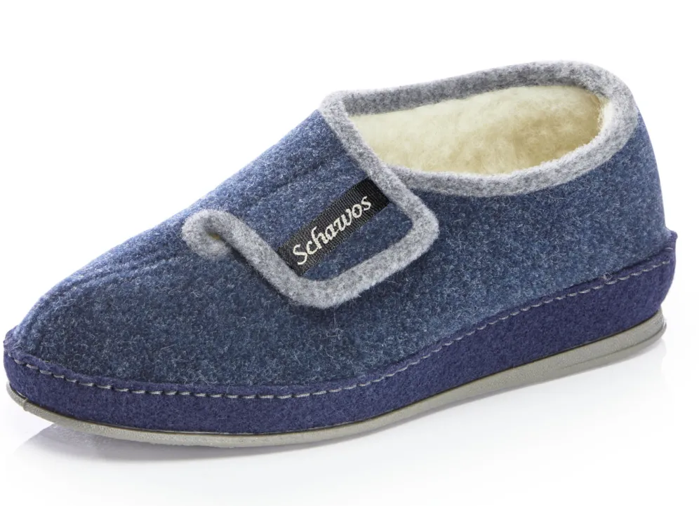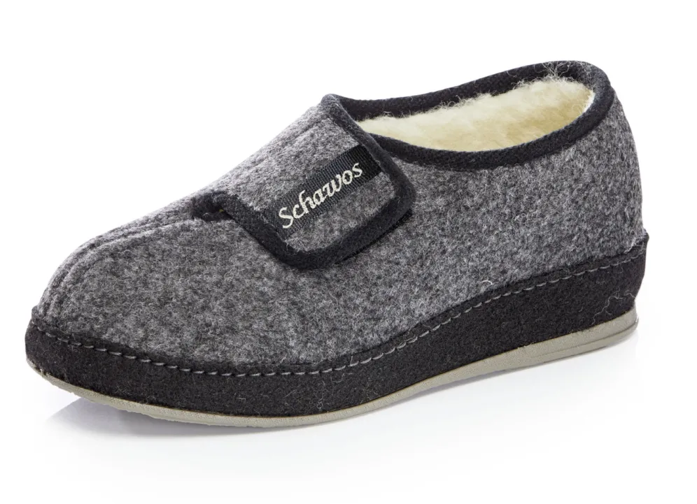 Atmungsaktive Hausschuhe aus Textil, mit verstellbarem Klettverschluss: Warmfutter und Fußbettbezug aus 100% Schurwolle, Fersenluftpolster, Filzschalensohle, TR-Laufsohle sowie 25 mm Keilabsatz