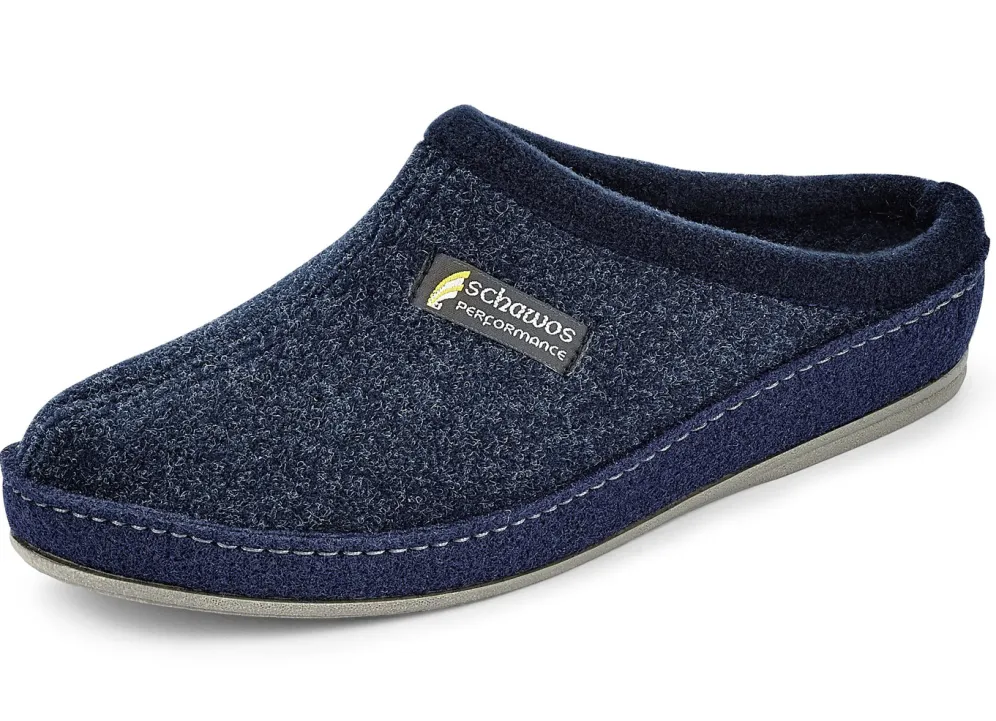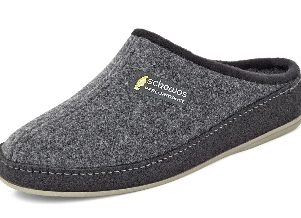 Hausschuhe aus atmungsaktivem Textilmaterial: anatomisch geformtes Fußbett mit Fersenluftpolster und Filzschalensohle sowie TR-Laufsohle