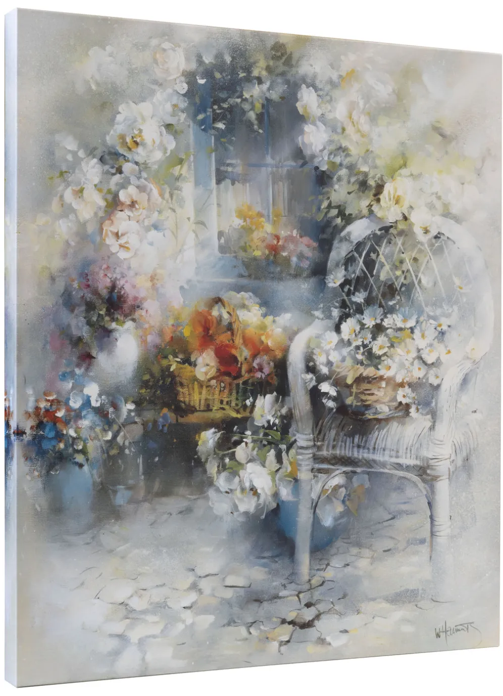 Dieses wunderschöne Bild vom Künstler Willem Haenraets zeigt einen Gartenstuhl umgeben von Blumen. Es trägt den Titel „Magic Moment“.