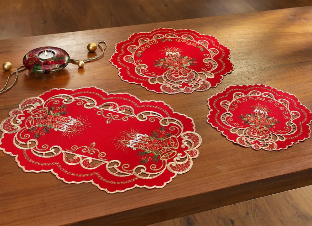 Aufwendig gestaltete Tisch- und Raumdekoration in Größe 101 (Deckchen oval, 35x 50 cm) und in Rot.
