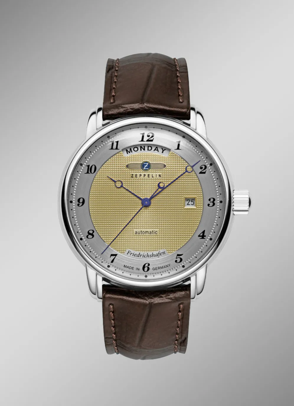 Die Zeppelin Friedrichshafen ist eine Automatikuhr aus der renommierten Serie Friedrichshafen, die an die legendären Luftschiffe erinnert, die einst die Welt eroberten. Diese Uhr vereint klassisches Design mit moderner Technik und höchster Qualität.