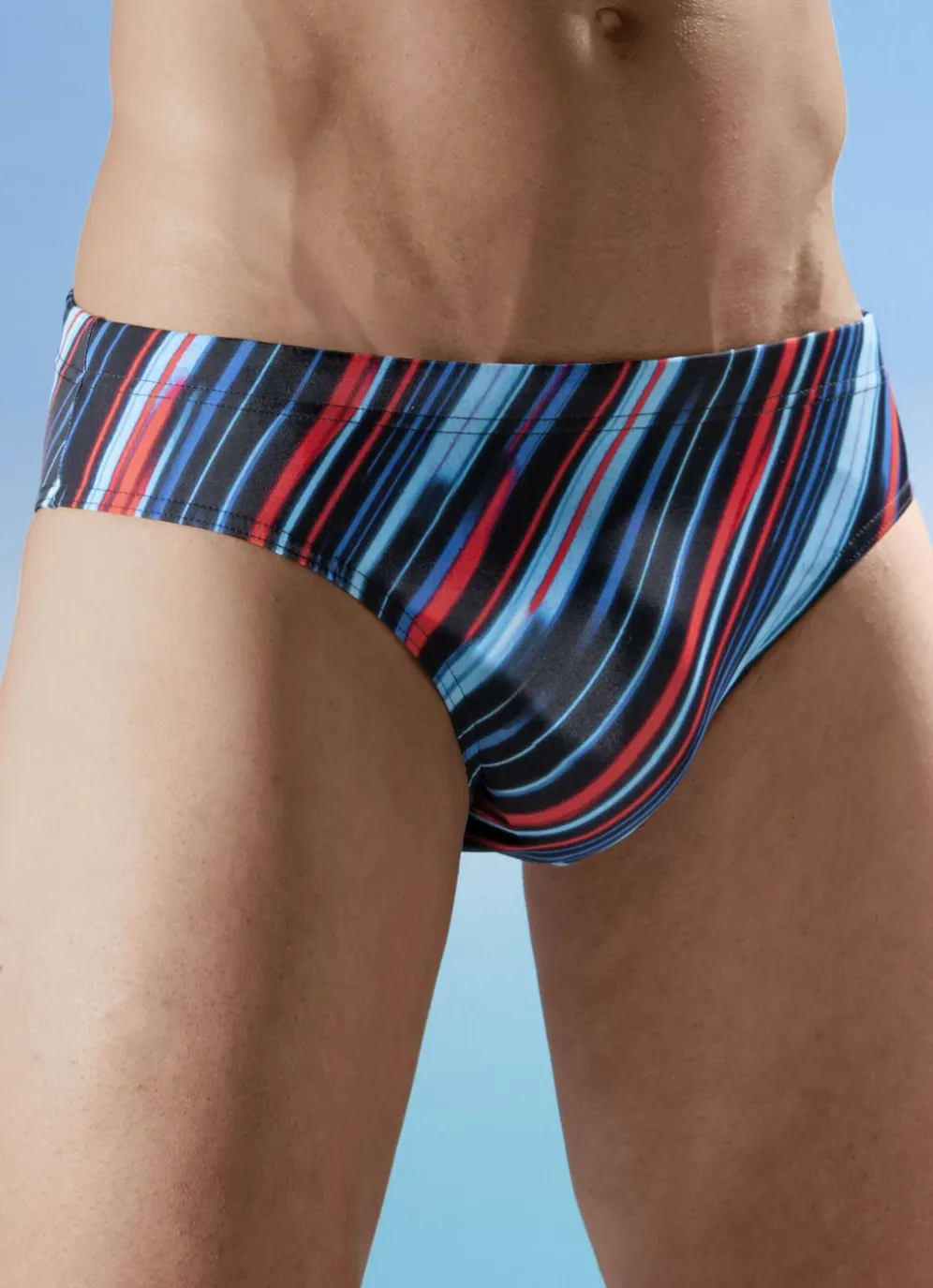 Badehose in Slipform, allover dessiniert in Schwarz-Bunt und in Größe 4.