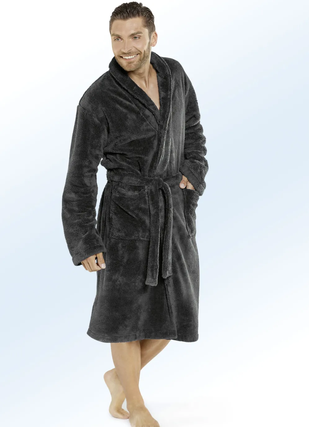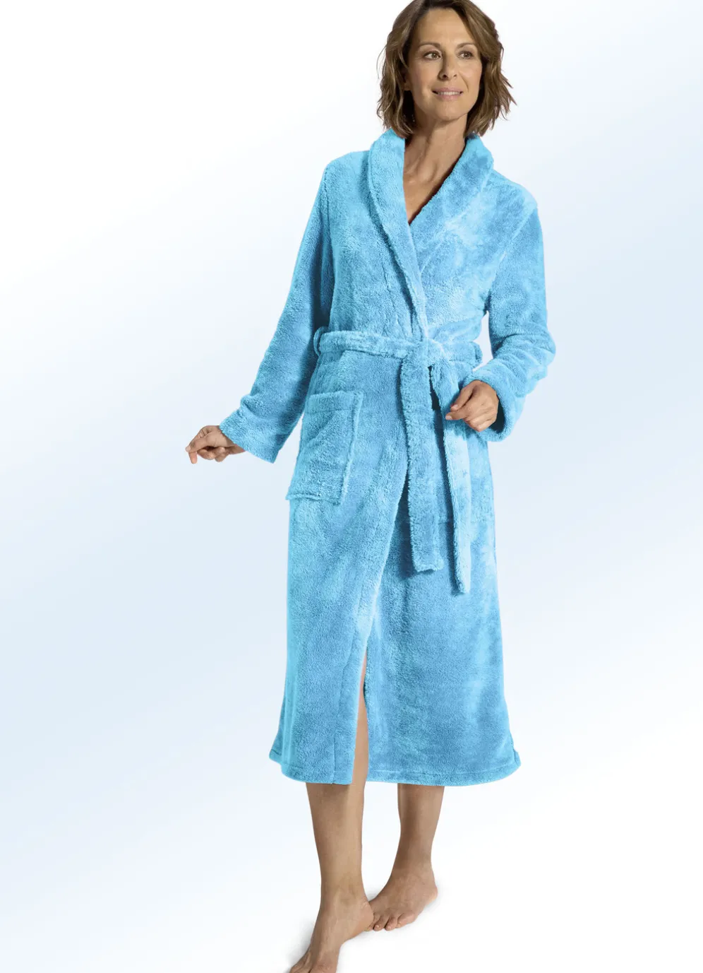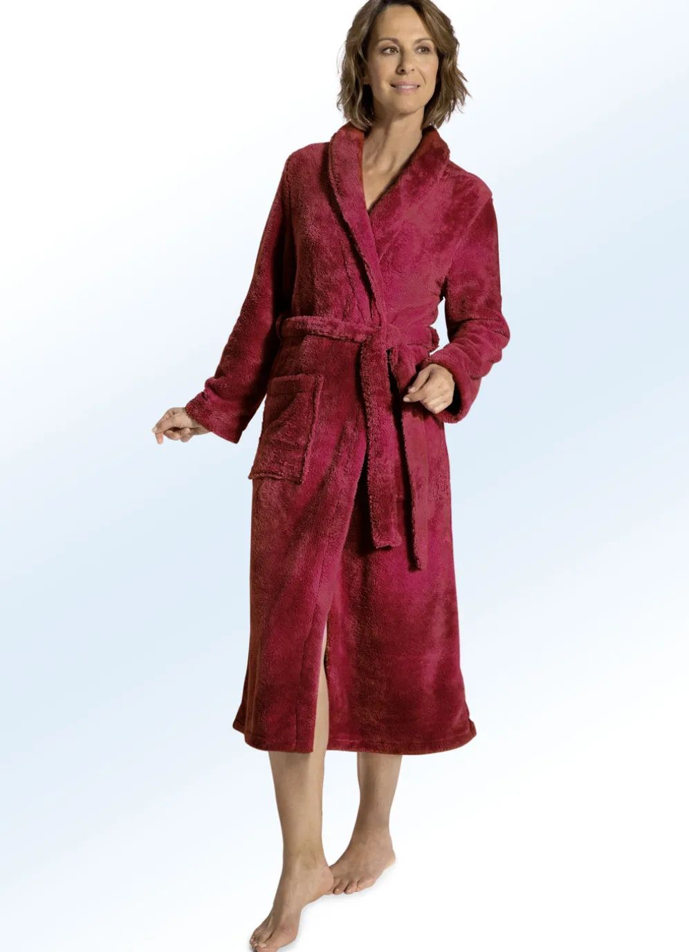 Flauschiger, wadenlanger Bademantel für Damen und Herren, mit Schalkragen, zwei aufgesetzten Taschen sowie Gürtelschlaufen und Bindegürtel.