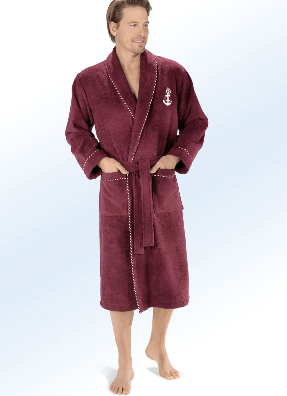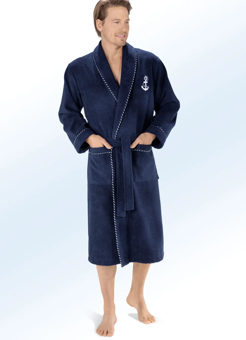 Einfach wohlfühlen in diesem Bademantel in wadenlanger Form: Anker-Stickerei im Vorderteil sowie gedrehte Zierkordel am Schalkragen, an den Ärmelabschlüssen und an den zwei aufgesetzten Taschen, Gürtelschlaufen und Bindegürtel.