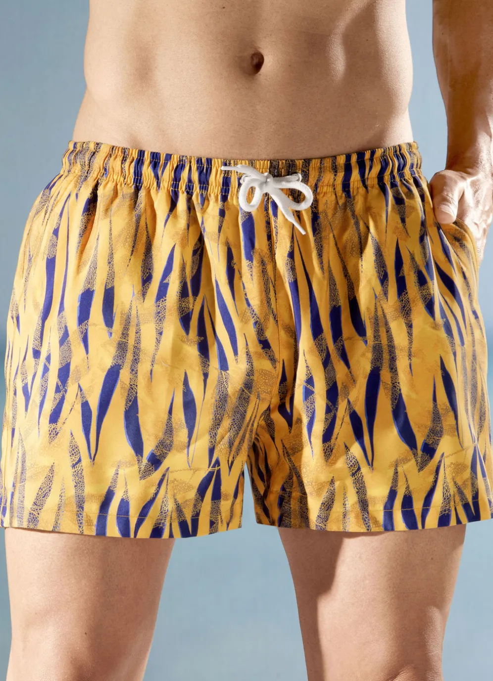 Badeshorts in Cognac-Royalblau mit Kordelzug im Dehnbund, aufgesetzter Gesäßtasche mit Klettverschluss, Seitentaschen sowie Innenslip.