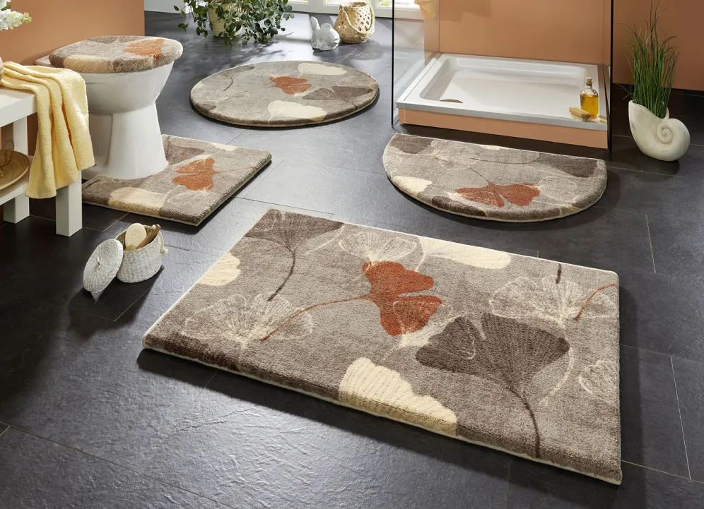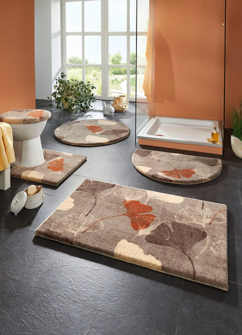 Detailliert ausgeführte, naturnahe Gingkoblätter zeigen sich auf dieser Badgarnitur mit Bandeinfassung sowie latexbeschichteter, rutschhemmender Rückseite. Höhe: 8 mm. Die angenehme Qualität: 100% Polyamid. Waschbar bis 30 °C und für Trockner und Fußbodenheizung geeignet