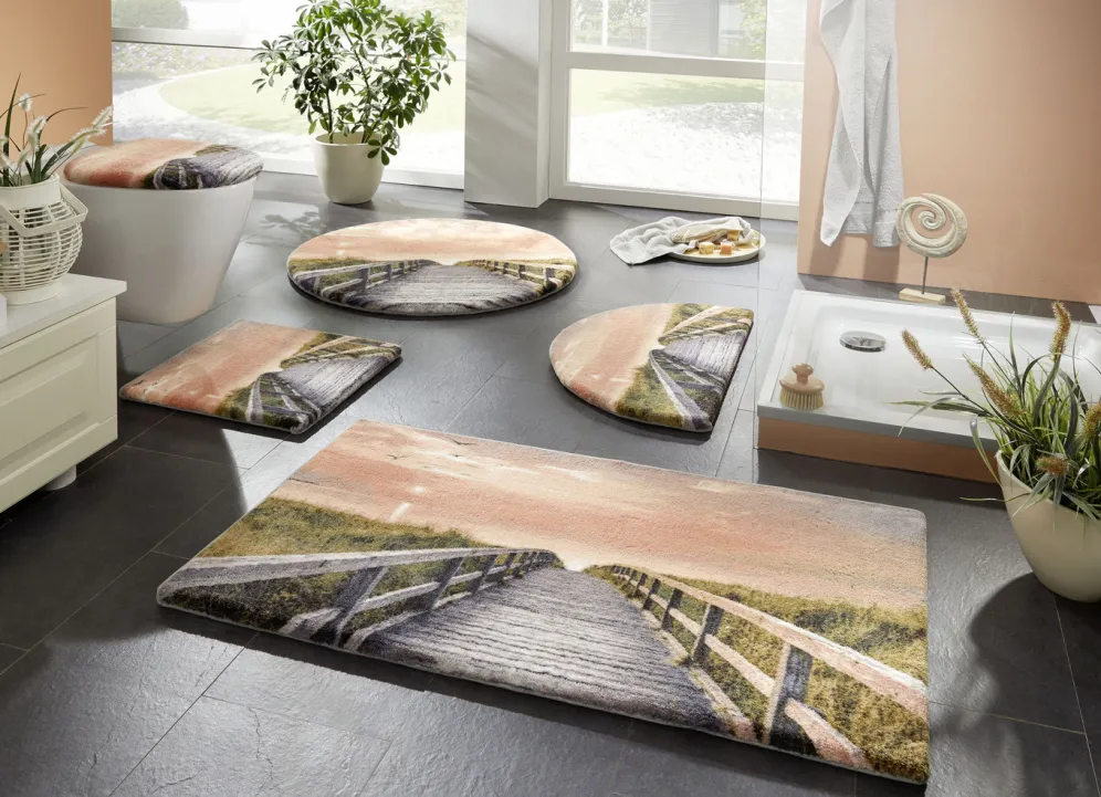 Sind Sie auf der Suche nach dem perfekten Wohlfühl-Akzent für Ihren Wellnessbereich? Mit dieser traumhaft bedruckten Badgarnitur zaubern Sie sich den Weg zum Meer in Ihr Zuhause. Mit Bandeinfassung und rutschhemmender Latex-Rückseite gefertigt. Florhöhe: ca. 8 mm. Qualität: 100% Polyamid. Waschbar bis 30 °C sowie für Trockner und Fußbodenheizung geeignet