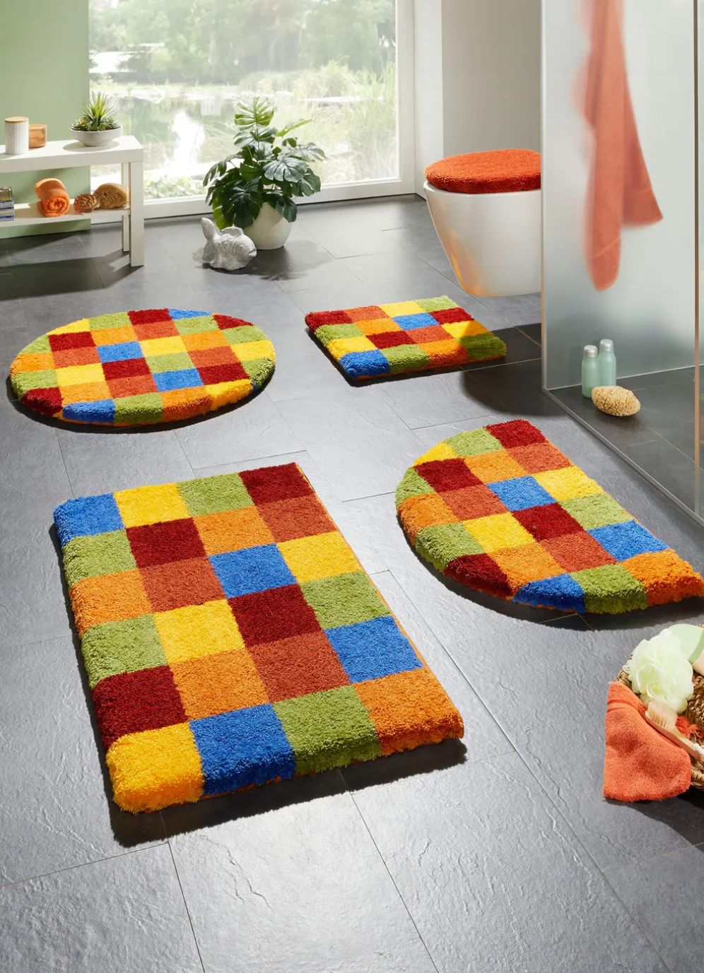 Badgarnitur mit bunten Dessin von Grund in Größe 112 (WC-Deckelbezug, 47/ 50 cm) und in Karo Bunt.