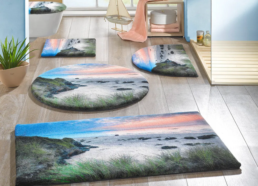 Verträumte Motive sind auf dieser Badgarnitur in eindrucksvoller Farbenpracht zu sehen. Mit schöner Bandeinfassung sowie rutschhemmend beschichteter Latex-Rückseite.