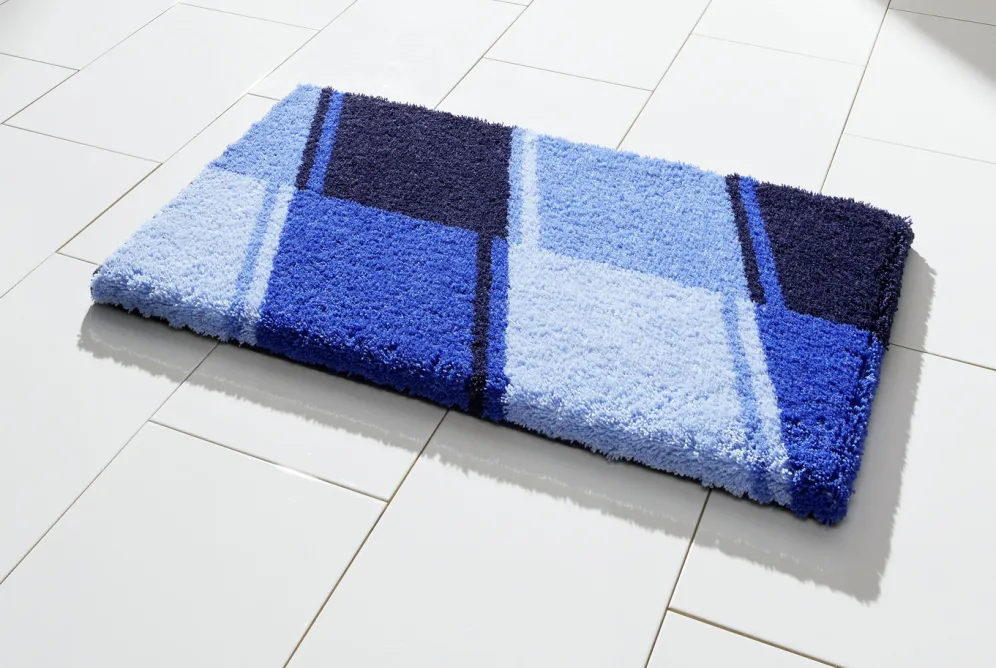 Badgarnitur mit rutschhemmender Rückseite in Größe 112 (WC-Deckelbezug, 47/ 50 cm) und in Blau.