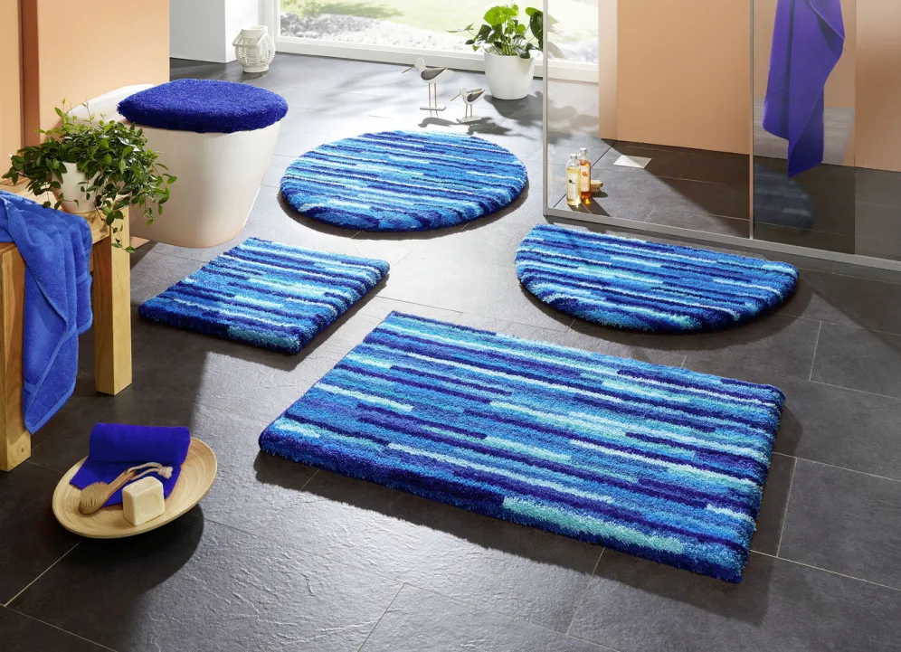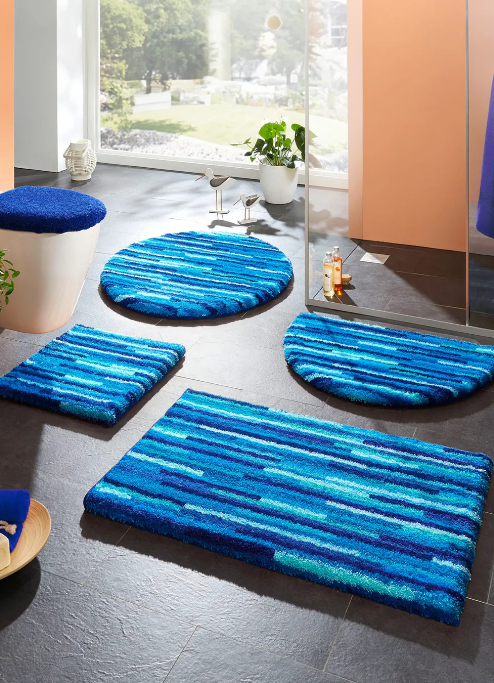 Badgarnitur mit rutschhemmender Rückseite in Größe 112 (WC-Deckelbezug, 47/ 50 cm) und in Blau.
