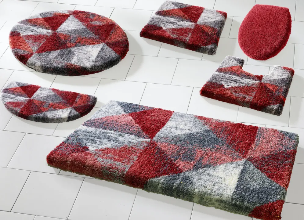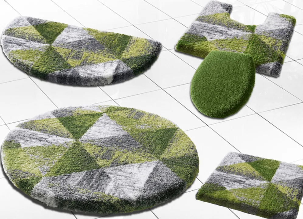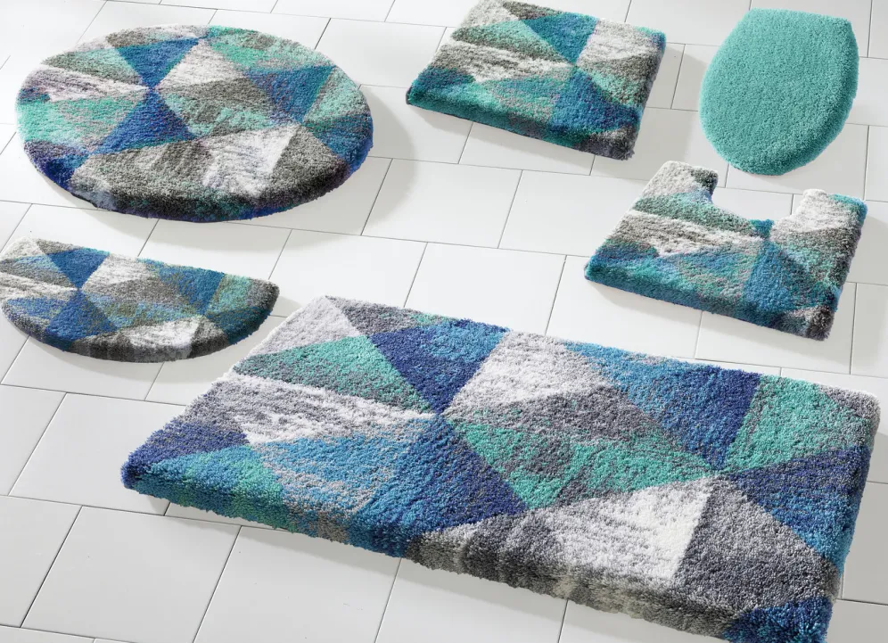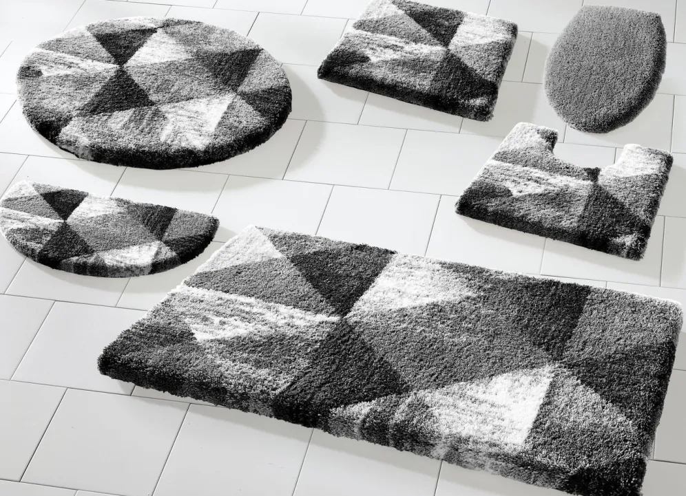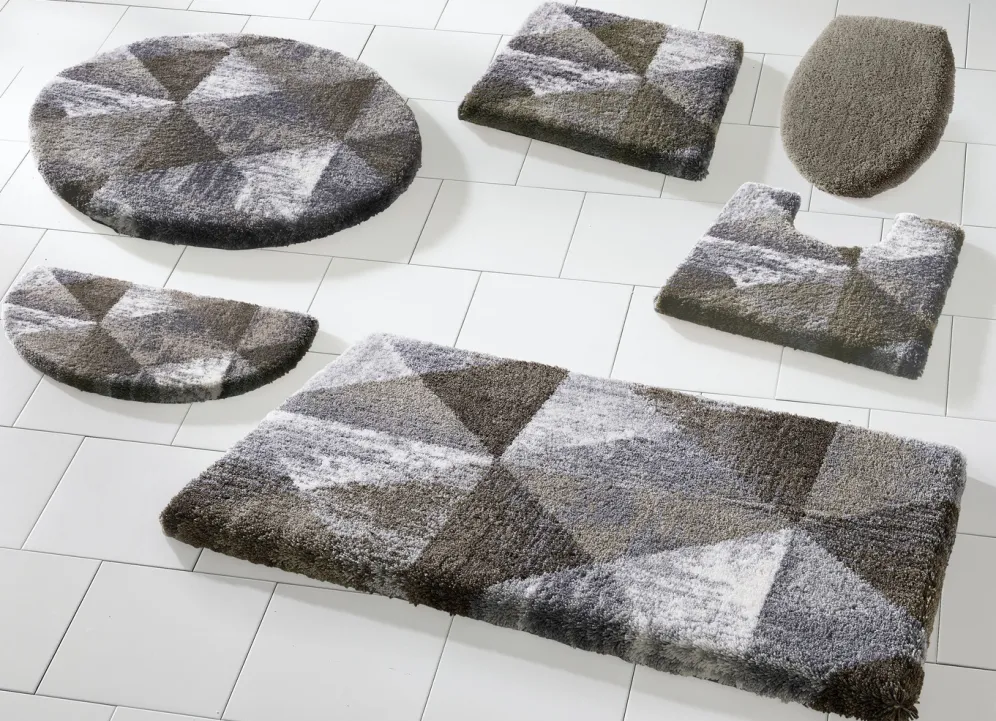 Ein modernes Wohlfühl-Ambiente kreieren Sie mit dieser bildschönen Badgarnitur von „Grund“, die mit geometrischem Dessin überzeugt. Höhe 20 mm. Mit latexbeschichteter, rutschhemmender Rückseite.