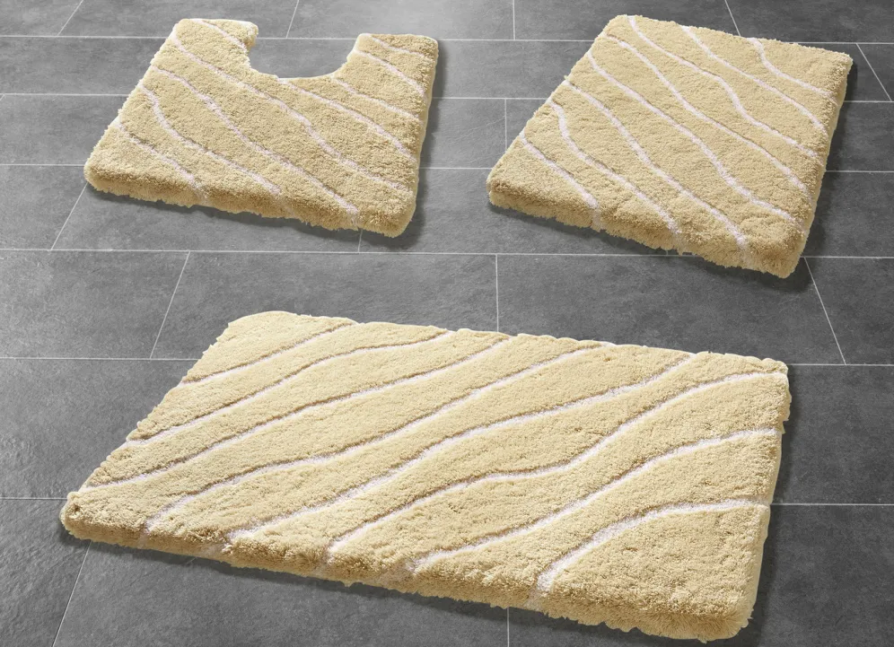 Badgarnitur von „Kleine Wolke“ in Größe 108 (Stand-WC-Vorleger, 55/ 55 cm) und in Beige.