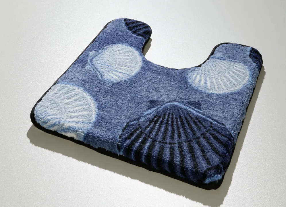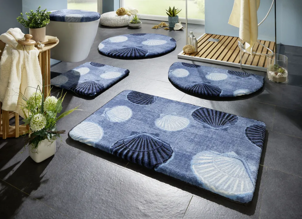 Badvorleger mit rutschhemmender Rückseite in Größe 112 (Motiv-WC-Deckelbezug mit Kordel, 47/ 50 cm) und in Blau.