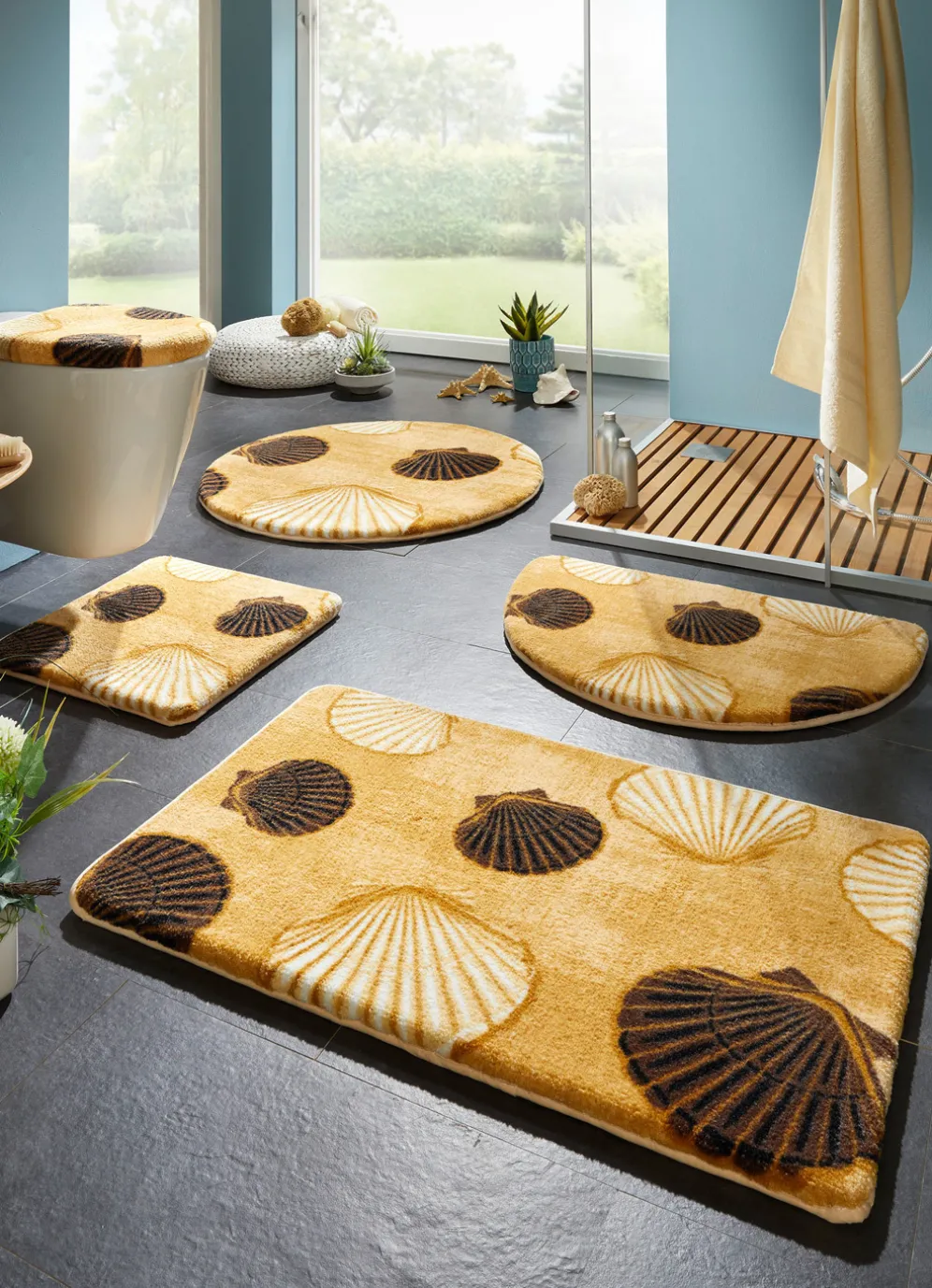 Wie ein Tag am Meer – diese tolle Badgarnitur zeigt wunderschöne Muscheln und bringt so den Strand in Ihr Badezimmer. Mit Bandeinfassung sowie latexbeschichteter, rutschhemmender Rückseite. Höhe: 8 mm. Die angenehme Qualität: 100% Polyamid. Waschbar bis 30 °C. Für Trockner und Fußbodenheizung geeignet.