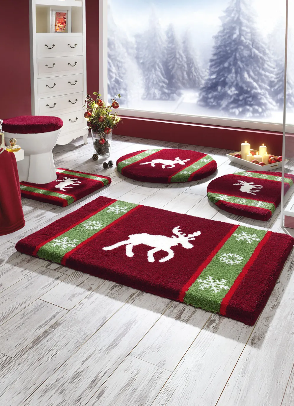 Mit wunderbar festlichen, farbenfrohen Elch-Motiven wird diese Badgarnitur von Grund Sie begeistern! Mit latexbeschichteter, rutschhemmender Rückseite. Höhe: ca. 20 mm. Besonders weiche Qualität: 100% Polyacryl Supersoft. Waschbar bis 40 °C. Für Fußbodenheizung und Trockner geeignet.