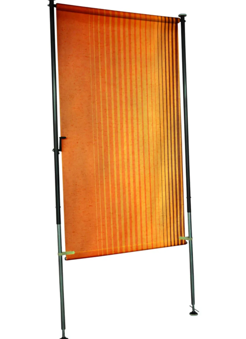 Balkon-Seitensichtschutz mit Bezug aus 100% Polyacryl und Gestell aus verzinktem, kunststoffbeschichtetem Stahlrohr. Einbauhöhe variabel von 225–275 cm, Stofflänge durch innenliegenden Kettenantrieb mit Kurbel verstellbar. Einbau-Breite 120 oder 150 cm. Vertikal gestreift. Beidseitig dessiniert.