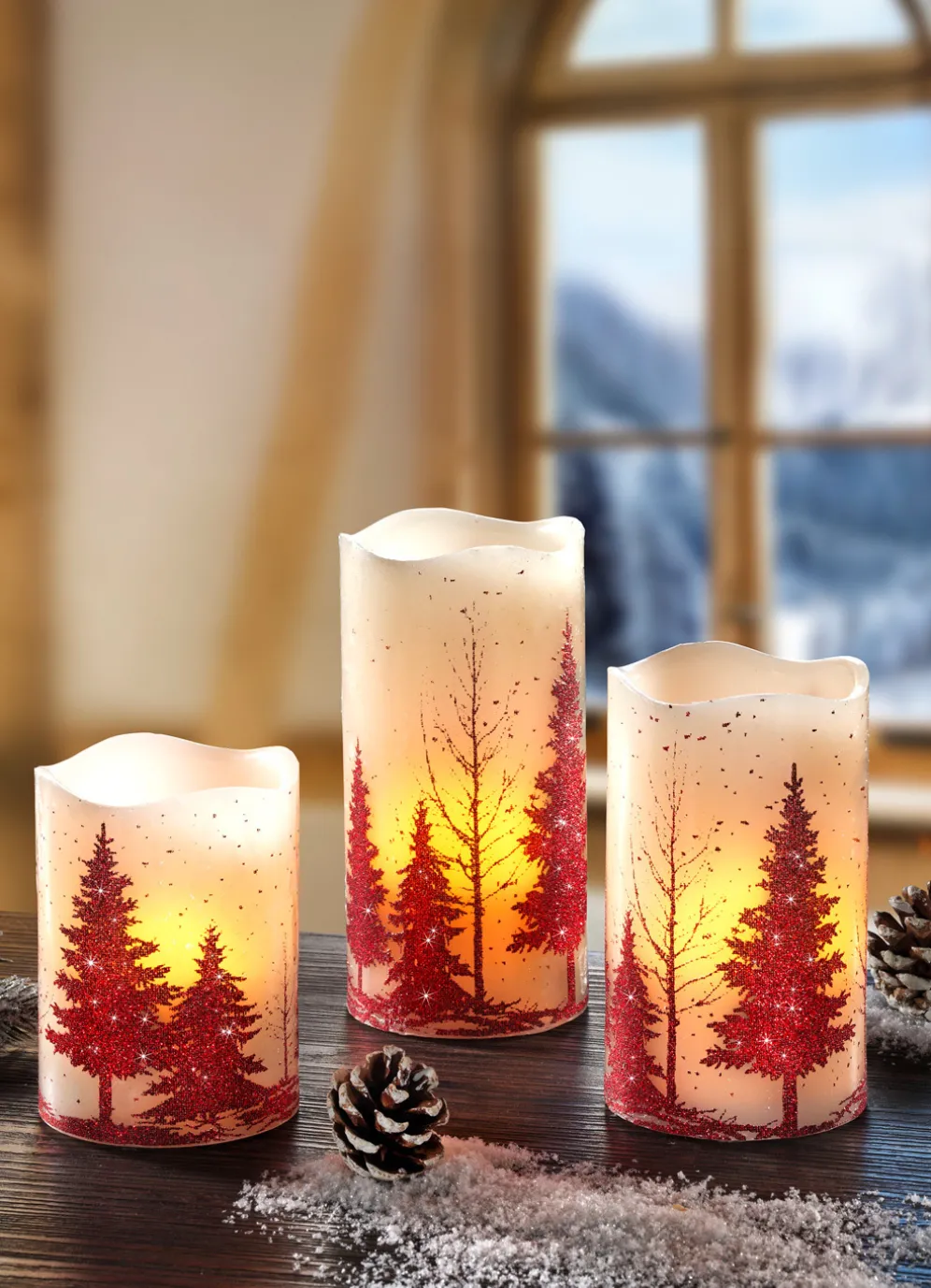 Mit diesen zauberhaften LED-Kerzen bringen Sie stimmungsvolles Licht in Ihr Zuhause. Die cremefarbenen Kerzen sind aus Echtwachs und rundum mit einem roten Tannenmotiv verziert.