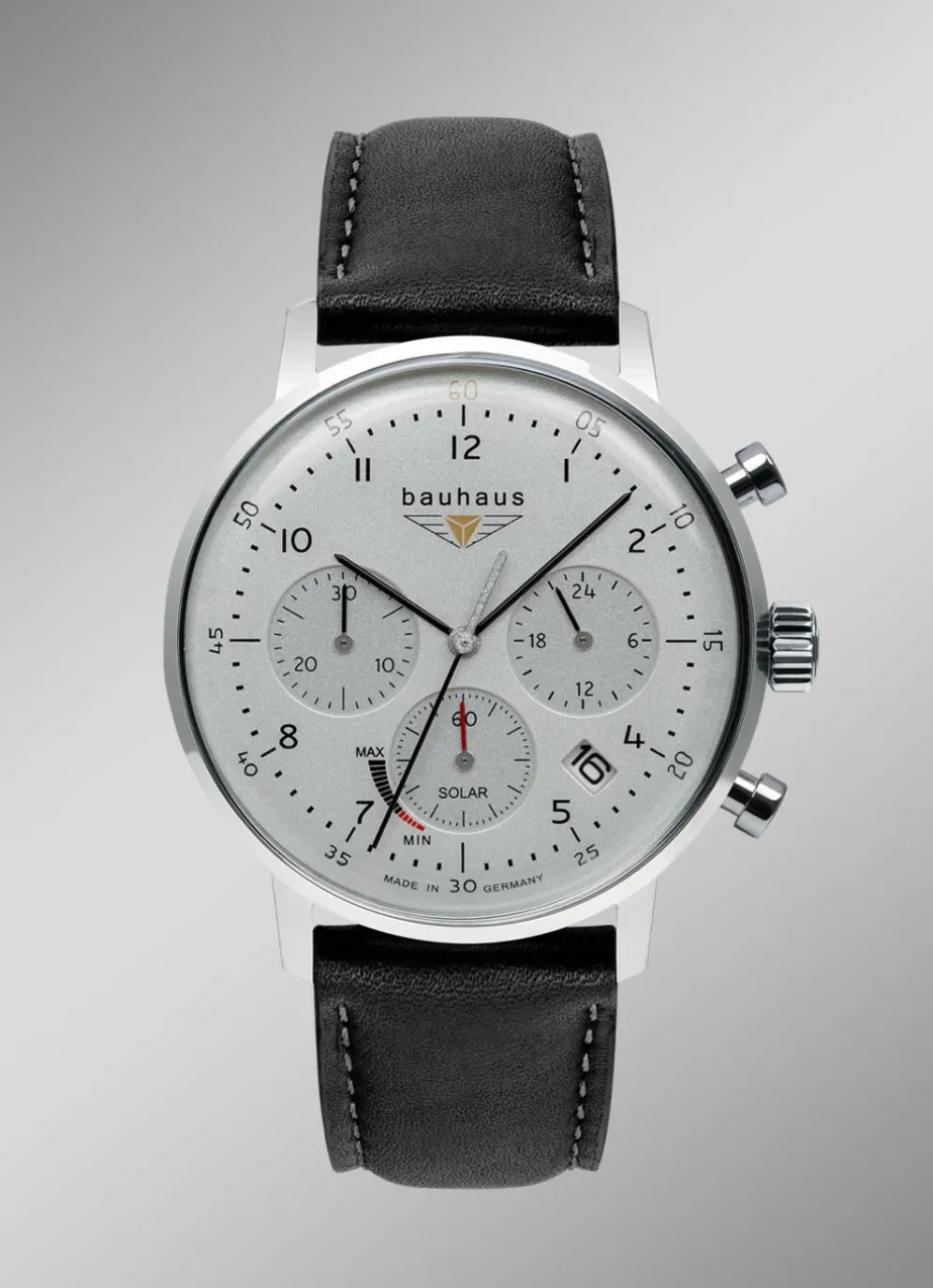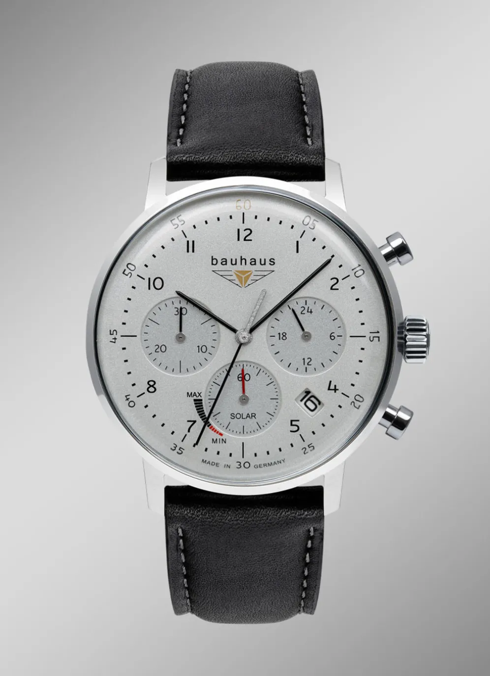 Die Bauhaus Classic ist nicht nur ein Symbol für Stil, sondern auch für Nachhaltigkeit, dank ihres effizienten Solarantriebs. Das klare Mineralglas schützt das Zifferblatt, während der Chronograph, das Datum, die Stoppuhr und die 12/24h-Anzeige Funktionalität und Vielseitigkeit bieten. Jedes Detail dieser Uhr wurde sorgfältig bedacht und umgesetzt, um Ihnen eine Uhr zu präsentieren, die nicht nur Made in Germany ist, sondern auch den Geist des Bauhaus-Designs verkörpert. Tragen Sie ein Stück Geschichte am Handgelenk.