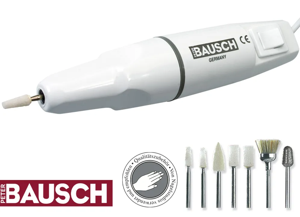 Profi-Maniküre-/Pediküre-Set von 3.000–12.000 U/min 6-stufig regelbar. Netztrafo, 2,5 m langes Spiralkabel, für große Bewegungsfreiheit. Inkl. Grundausstattung bestehend aus 7 Original-Nagelpflege-Aufsätzen (2x keramischer Schleifstift spitz, 2x keramischer Schleifstift Zylinder, Topfbürste, Filzpolierer, Diamantfräser Geschossform), zum Feilen, Schleifen, Polieren usw. Dank Steckbefestigung – sicherer Halt der Aufsätze. Das Gerät liegt leicht in der Hand. Ein- und Ausschalter direkt am Gerät integriert. 22 Watt, 230 Volt