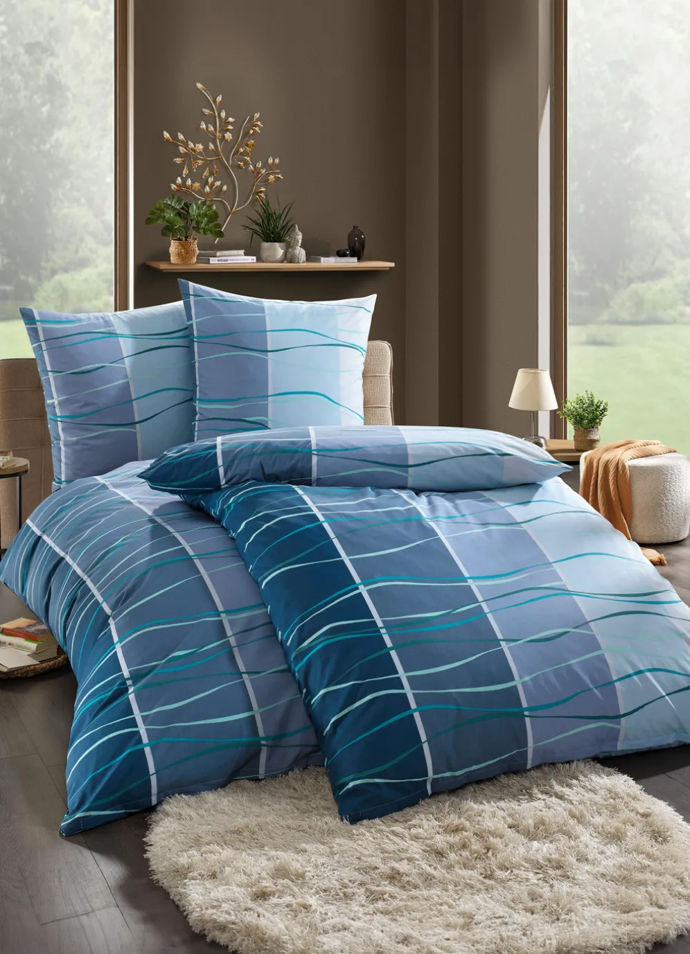 In moderner Kombination von zeitlosen Streifen und einer farblich passenden Wellenverzierung präsentiert sich diese pflegeleichte, beidseitig bedruckte Bettwäsche-Garnitur in angenehmen Blautönen. Mit praktischem Reißverschluss.