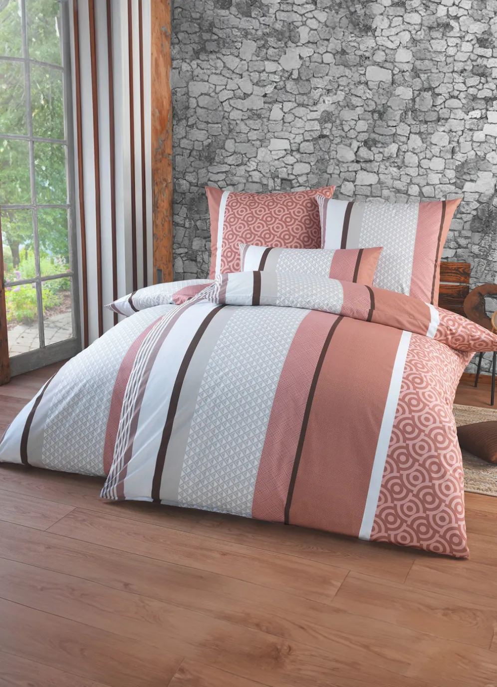 Diese sehr elegante, beidseitig bedruckte Bettwäsche-Garnitur überzeugt mit einem schön kombinierten Streifendessin und bringt eine neue Optik in Ihr Schlafzimmer. Mit praktischem Reißverschluss.
