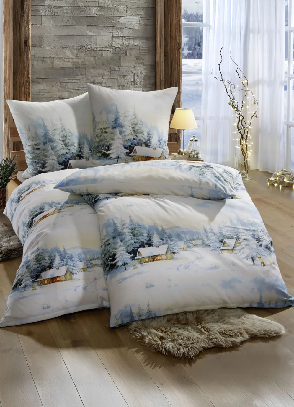 Beidseitig bedruckte Bettwäsche-Garnitur mit Winterlandschaft