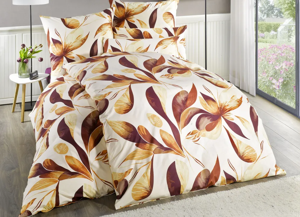 Beidseitig bedruckte Bettwäsche-Garnitur von Florella in Größe 111 (40/80 cm + 135/200 cm) und in Terra.