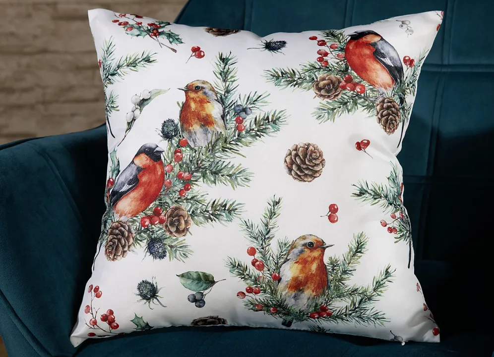 Ein niedlicher Blickfang ist dieser Kissenbezug mit seinem naturnahen Motiv: Süße Rotkehlchen haben sich auf beerentragenden Nadelzweigen niedergelassen. Beidseitig bedruckt sowie mit praktischem Reißverschluss ausgestattet. Die Qualität: 100% Polyester. Waschbar bis 30 °C. Maße: 40×40 cm.