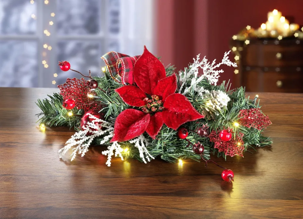 Dieser schöne Tischaufleger wurde aufwendig aus Tannenzweigen, Beeren, Kugeln und einer prächtigen Poinsettiablüte gefertigt. Die 10 eingearbeiteten LED-Lämpchen bringen das Arrangement zum Strahlen. Batteriebetrieben mit 2x 1,5 Volt Mignon (nicht im Lieferumfang enthalten).