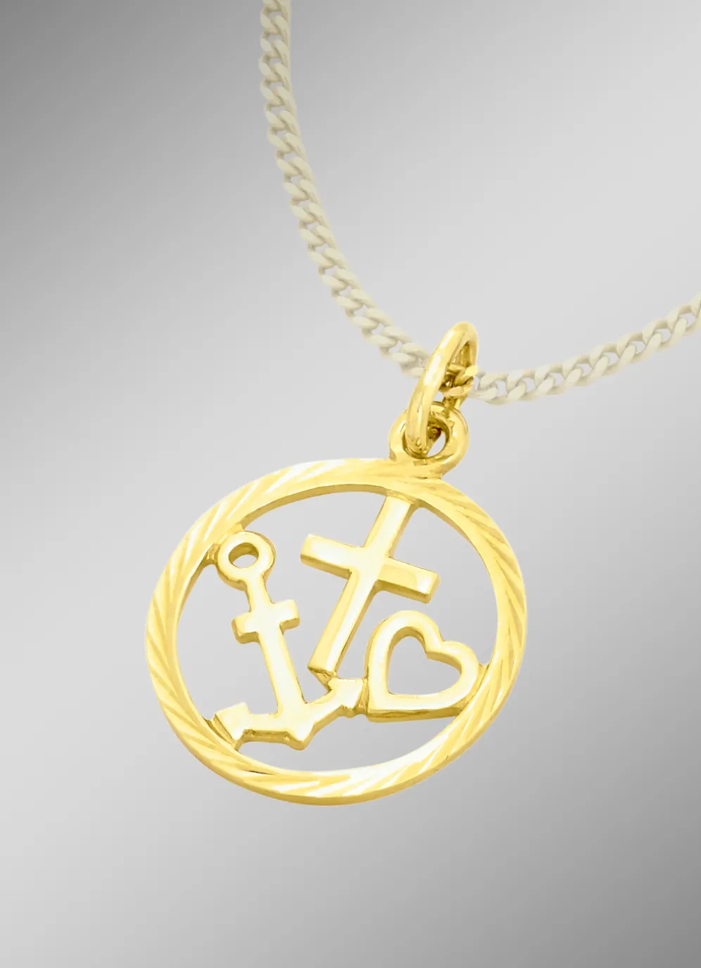 Beliebter „Glaube, Liebe, Hoffnung“ Anhänger ist ein echter Blickfang. Das aus Gold 585/-fein oder Gold 333/-fein, gefertigte Schmuckstück hat den Durchmesser von ca. 14 mm. Ob für den Freizeitlook oder chic und elegant, dieser Anhänger macht jedes Outfit perfekt!