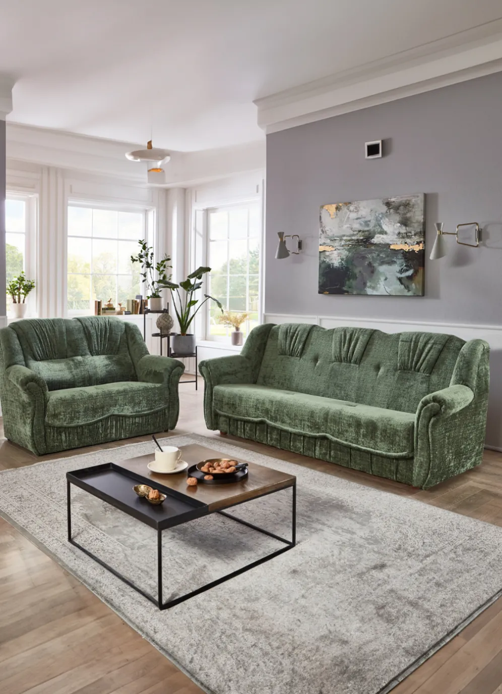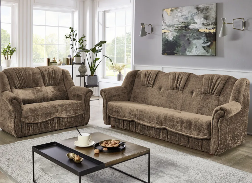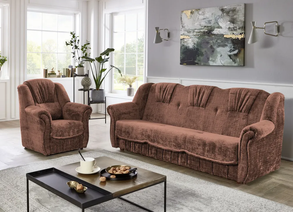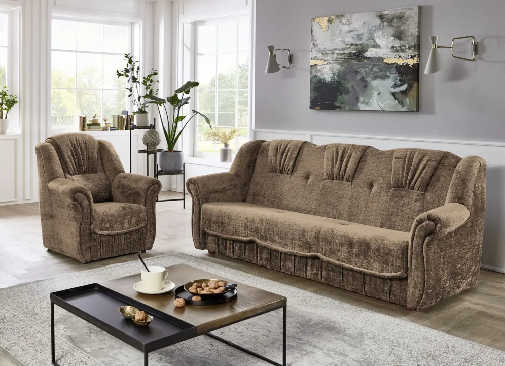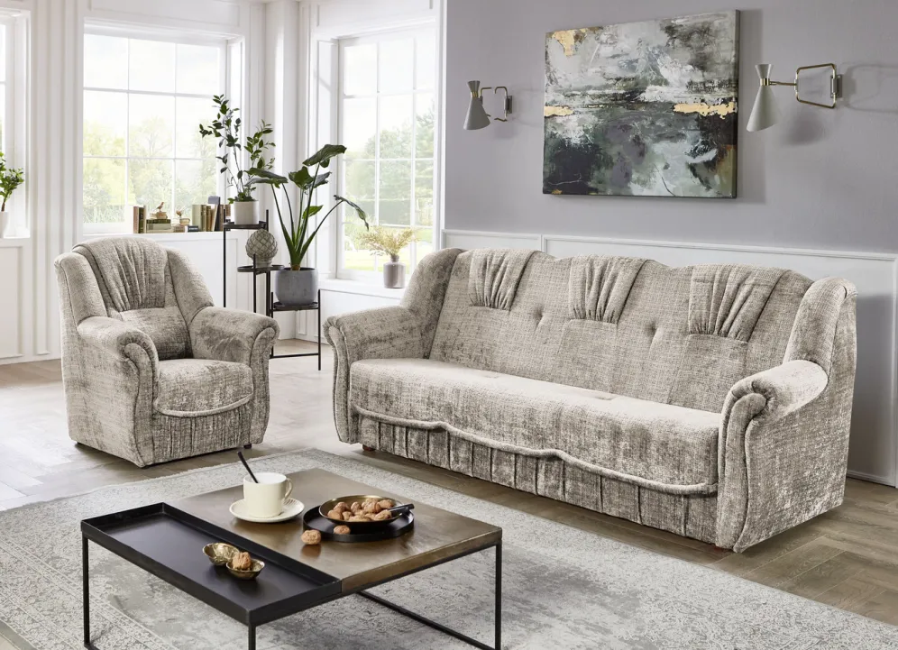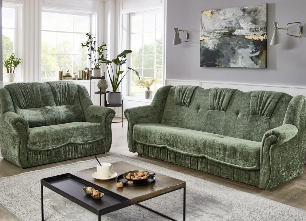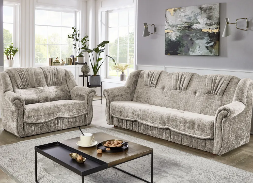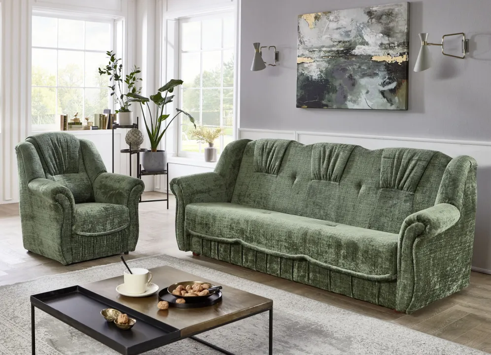 Herrlich bequeme Polstermöbel! Auf massivem Holzgrundgestell, mit hochwertigem Bonnellfederkern und Komfortschaum-Polsterung. Ansprechender Bezug (100% Polyester) mit dekorativer Steppung sowie in 4 tollen Farben zur Auswahl. Die Rückseiten sind mit Originalstoff bezogen, daher frei im Raum aufstellbar. Dreisitzers mit Spannstoff bezogen. Der Dreisitzer mit Bettkasten ist im Handumdrehen zu einem Bett ausklappbar (Liegefläche 120×195 cm). Auf stabilen, schwarzen Kunststofffüßen