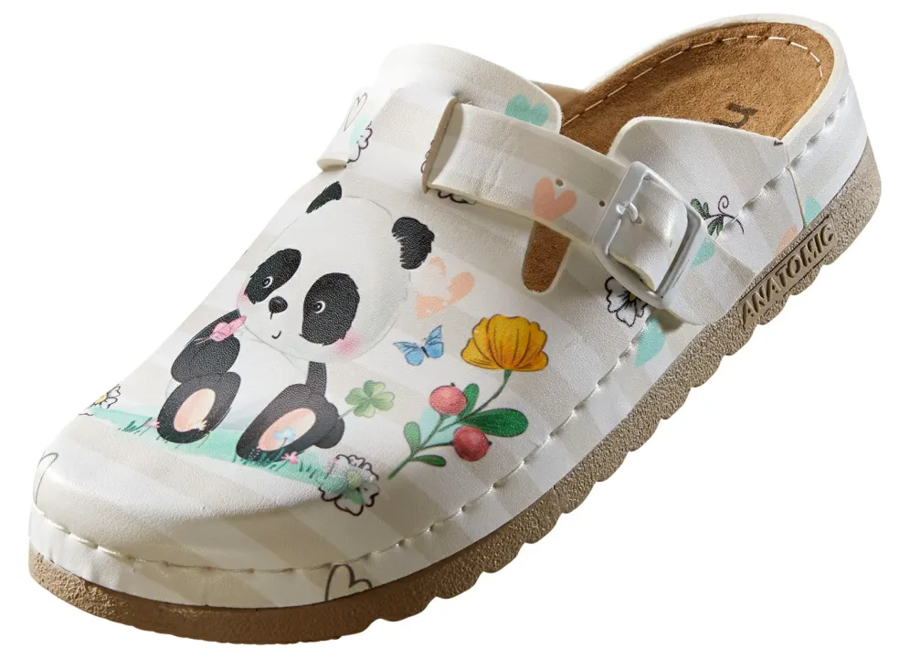 Bequemer Clog mit niedlichem Panda-Druck in Weiss-Beige und in Größe 39.