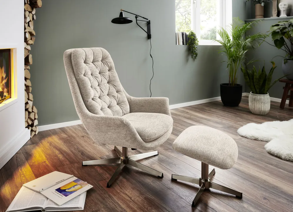Bequemer Relax-Sessel mit Hocker in Beige.