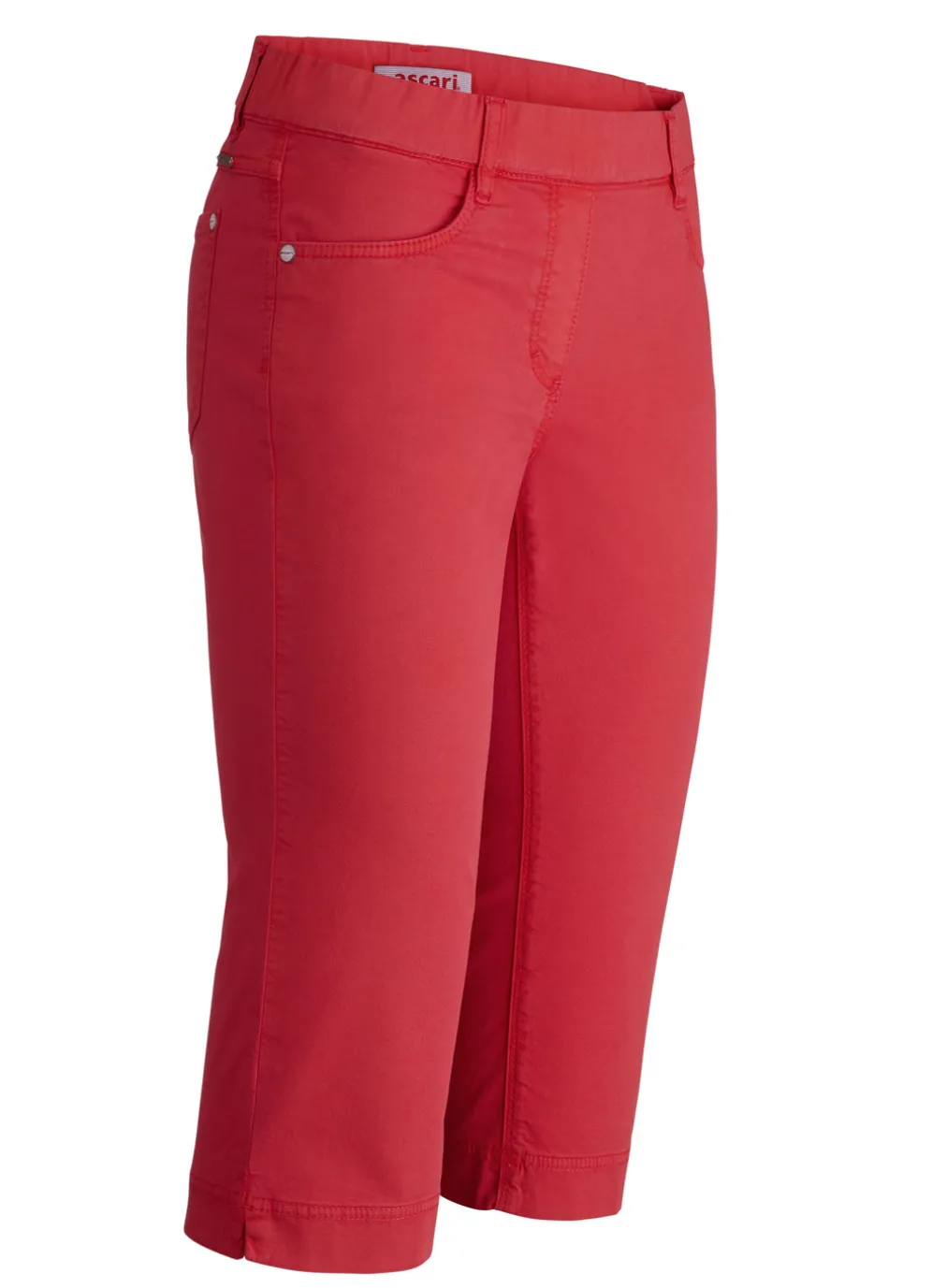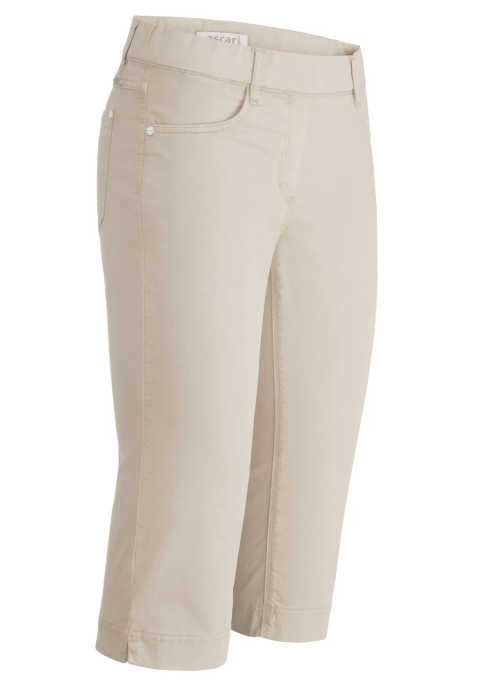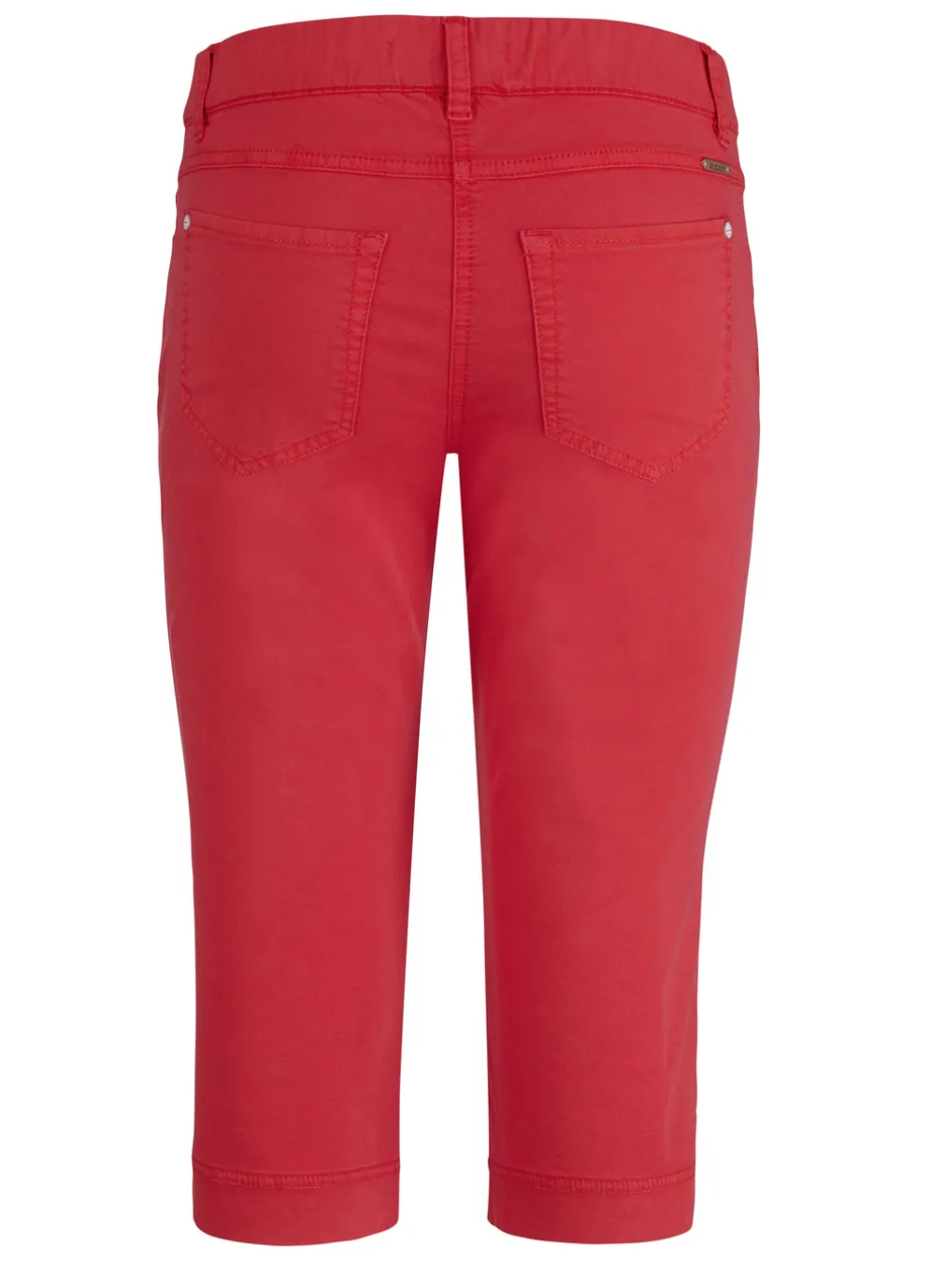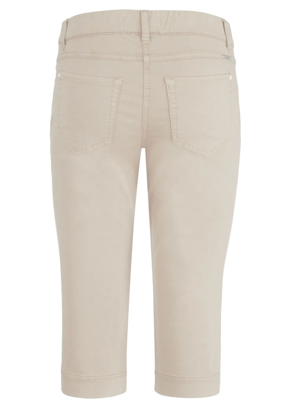 Attraktive Bermudas in bequemer Schlupfform mit komfortablem Dehnbund rundum: Gürtelschlaufen, Reißverschluss-Zierblende, Seitentaschen, aufgesetzte Gesäßtaschen, figurformende Passe im Rückteil sowie seitliche Schlitze an den Beinabschlüssen. Innenbeinlänge ca. 42 cm.