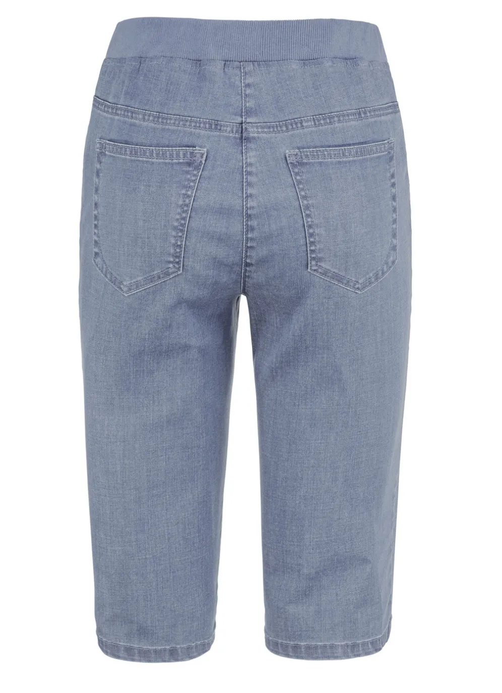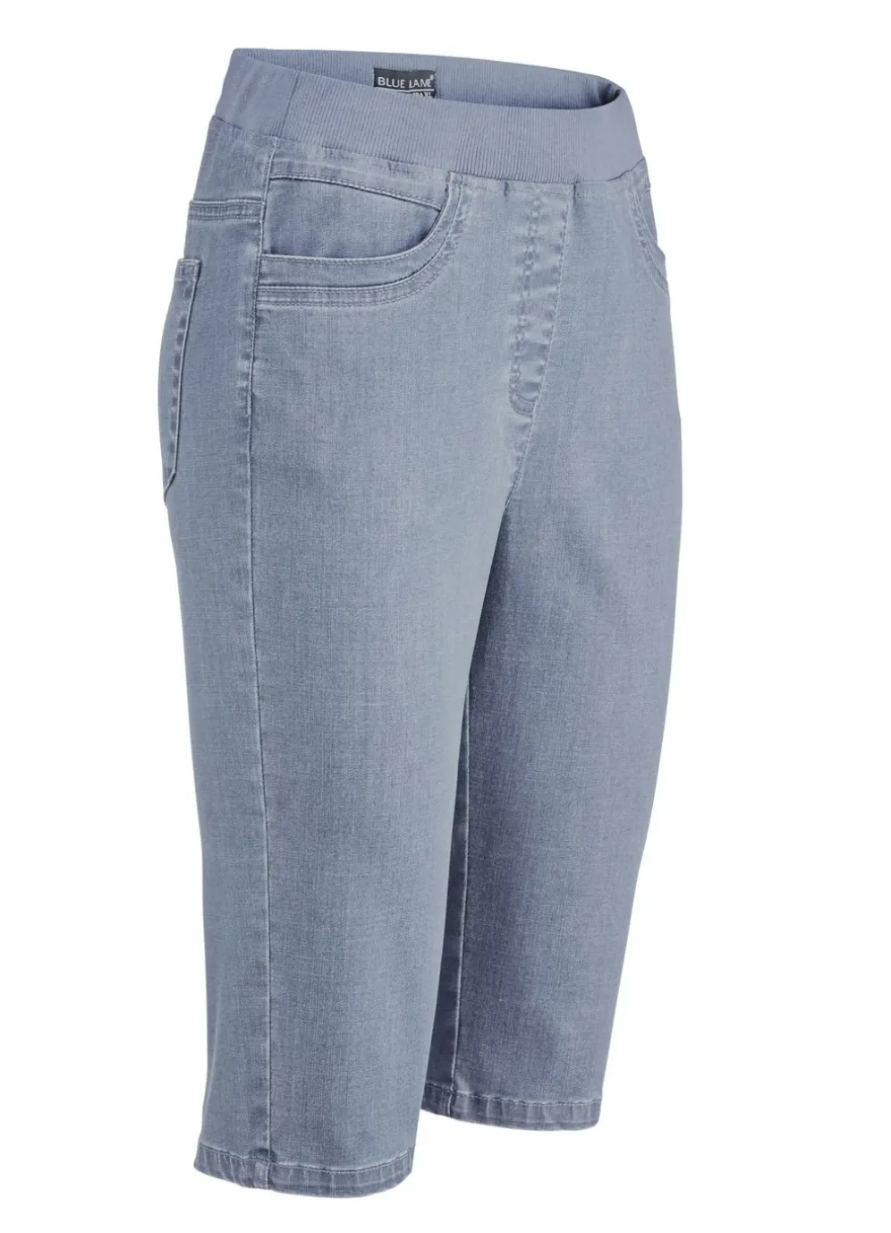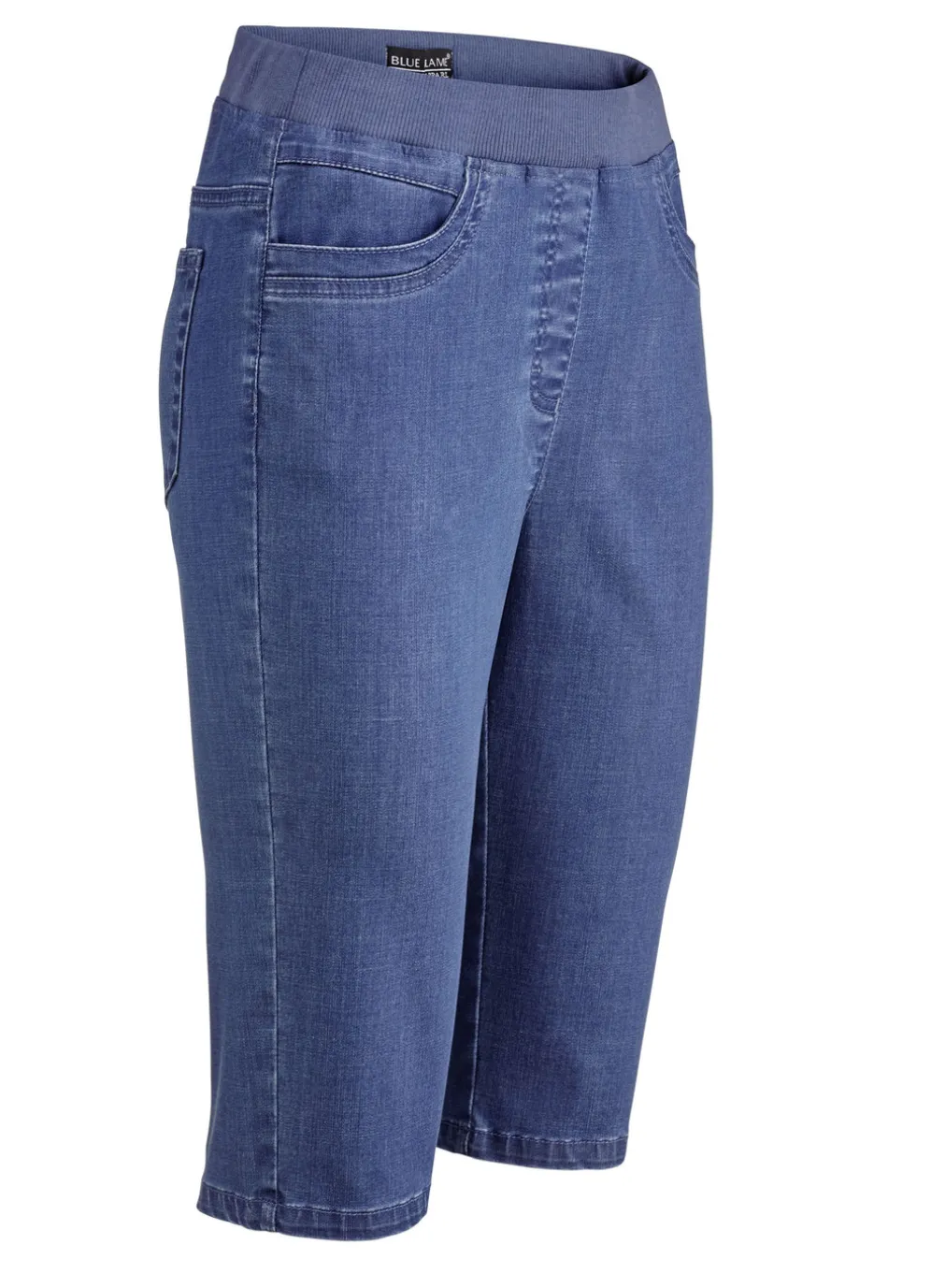 Trendig und superbequem zugleich: Jeans-Bermudas in Schlupfform, formbeständiger Rundum-Dehnbund in Jersey-Qualität, angedeutete Reißverschluss-Zierblende, Seitentaschen, aufgesetzte Gesäßtaschen sowie Jeanssattel. Innenbeinlänge ca. 35 cm